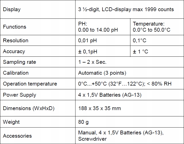 РН-метр 2-в-1 із керуванням однією рукою вимірює значення pH рідин за допомогою гальванічної різниці напруг між кислими, нейтральними та лужними рідинами. Крім того, вимірюється і відображається температура рідини, при цьому обидва виміряні значення одночасно відображаються на рідкокристалічному дисплеї з постійним підсвічуванням. До міцного водонепроникного корпусу прикріплено легкозамінну головку датчика, яка включає датчик для вимірювання pH і температури в °C або °F.