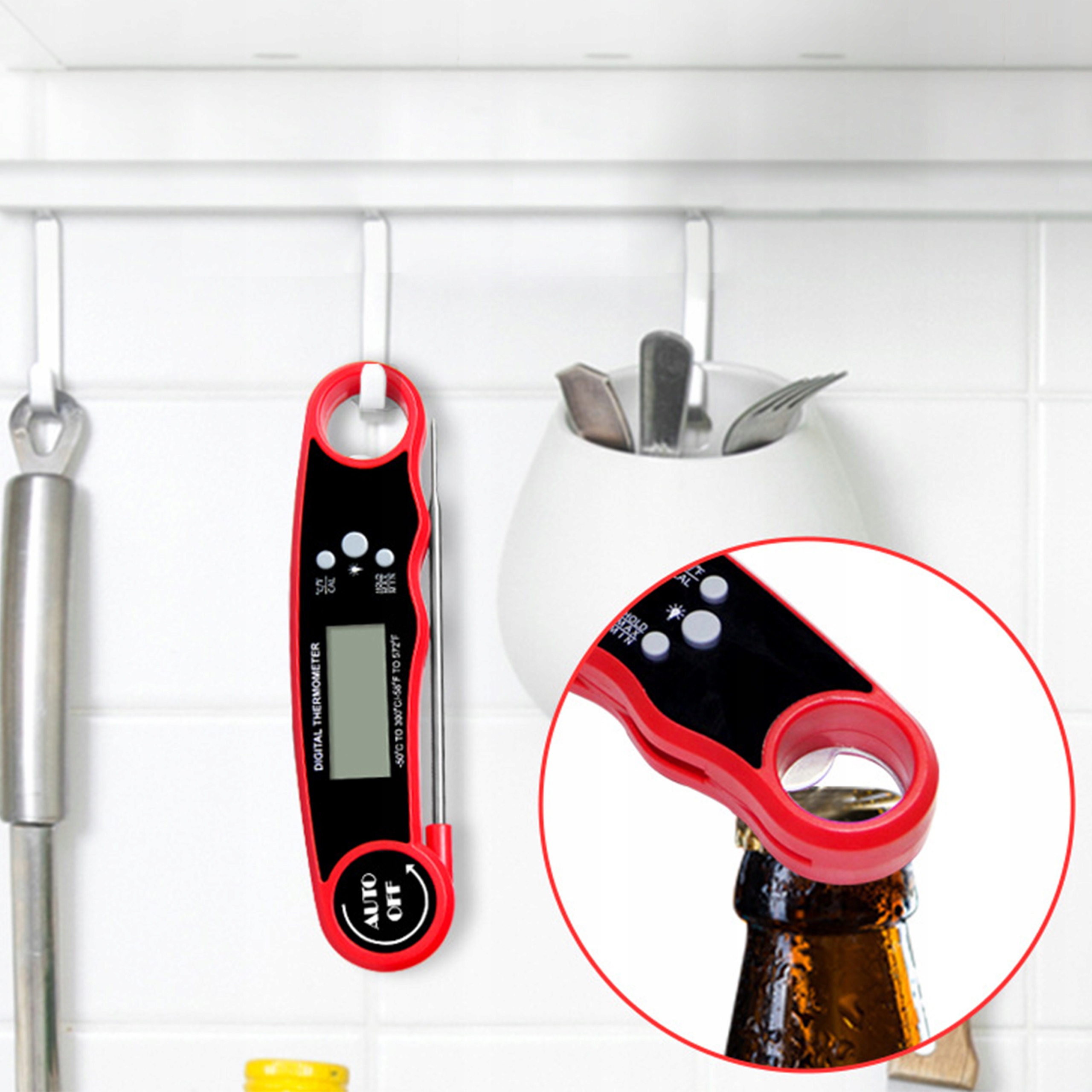 ⭐ Відкривачка для пляшок - обладнання, яке завжди варто мати з собою, щоб відкрити улюблений напій закритим з кепкою. Термометр KT04 має невеликі розміри, його легко транспортувати, а також можна повісити на холодильник завдяки магнітам.