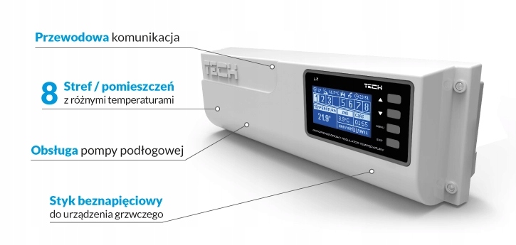 - Підтримка макс. 50 термоелектричних приводів із використанням 22 виходів із використанням 8 кімнатних датчиків C-7 p