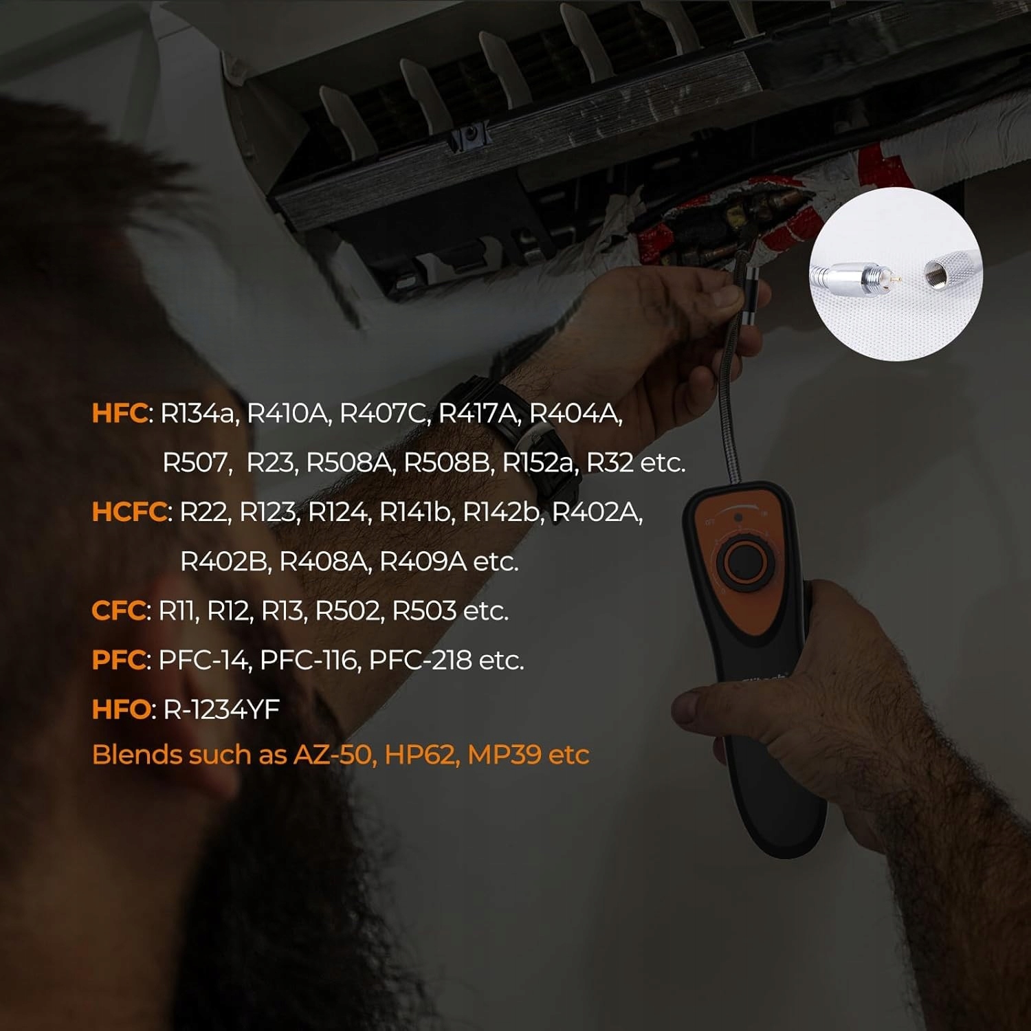 - Повне покриття різних газів: підтримує виявлення CFC, HCFCS, HFCS, HFCS, HFOS та інших типів охолоджувальних газів.
