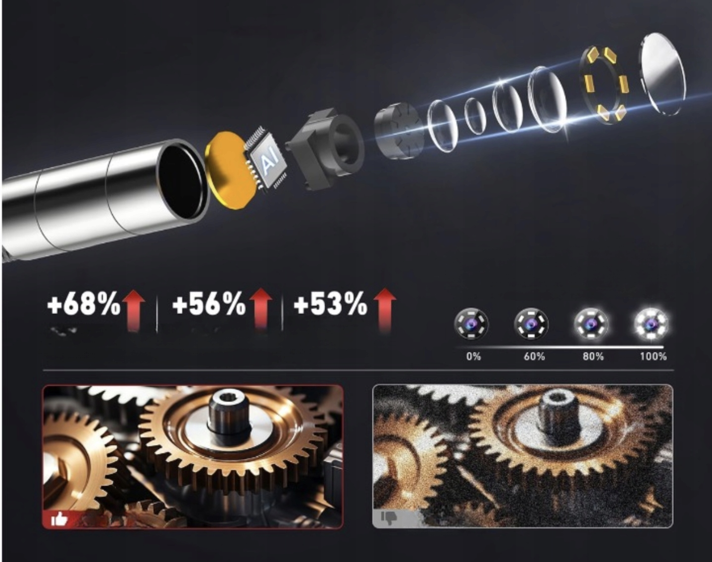 Завдяки новітнім технологіям зонд цієї ендоскопічної камери можна обертати на 360° за допомогою джойстика для полегшення видимості в отворі циліндра. Ви здивуєтеся, наскільки легко досягти потрібного кута.