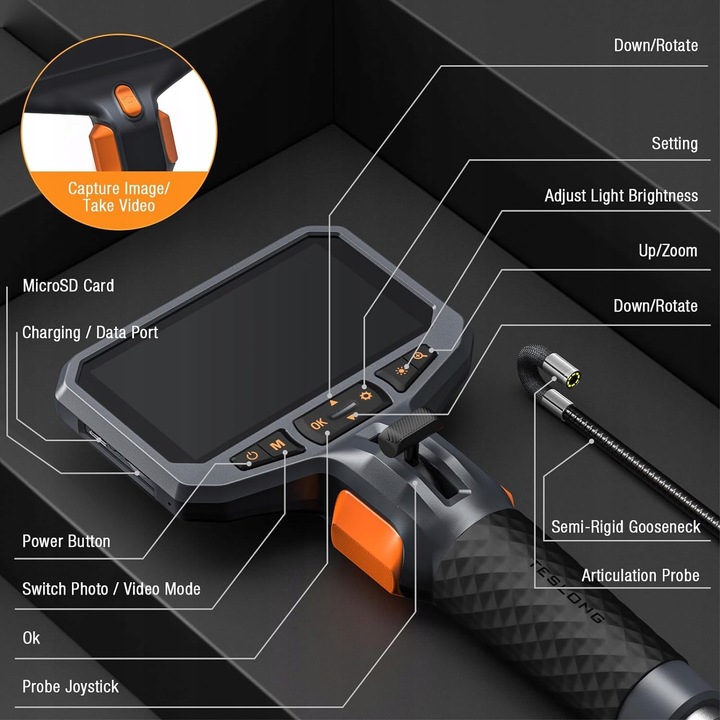 ⭐5.0 "IPS РК -індустріальний екран ендоскопічна камера цифрова ендоскопічна камера з екраном HD LCD 5.0". Ця інспекційна камера робить різкі фотографії 2 Мп, ви також можете сфотографувати та відео.