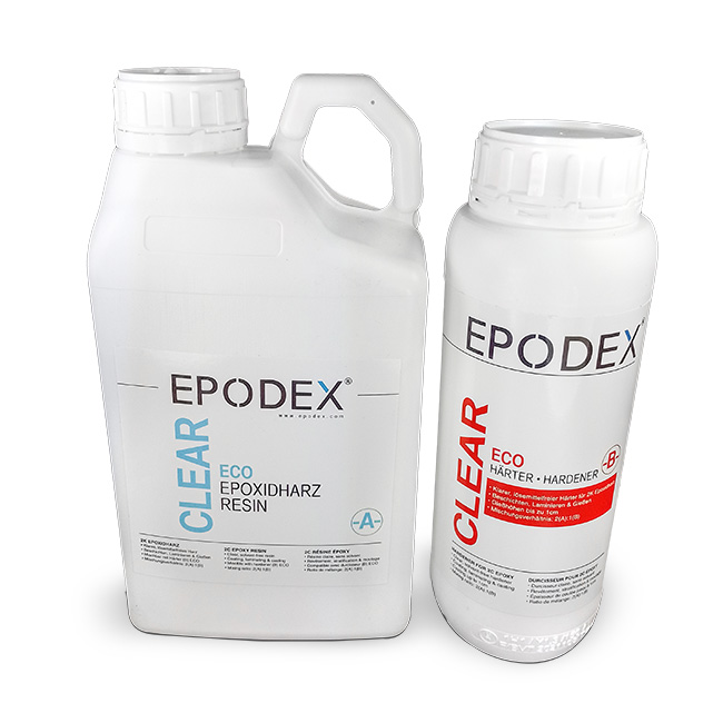 EPODEX CLEAR ECO + ECO - це прозора епоксидна система, що складається зі суміші смоли та затверджувача у простих вагових пропорціях 100:50. Система призначена для покриття, ламінування, ремонту, склеювання, просочування та лиття об'єктів товщиною до 1 см в один шар. Можливість зміни кольору за допомогою барвників та пігментів.