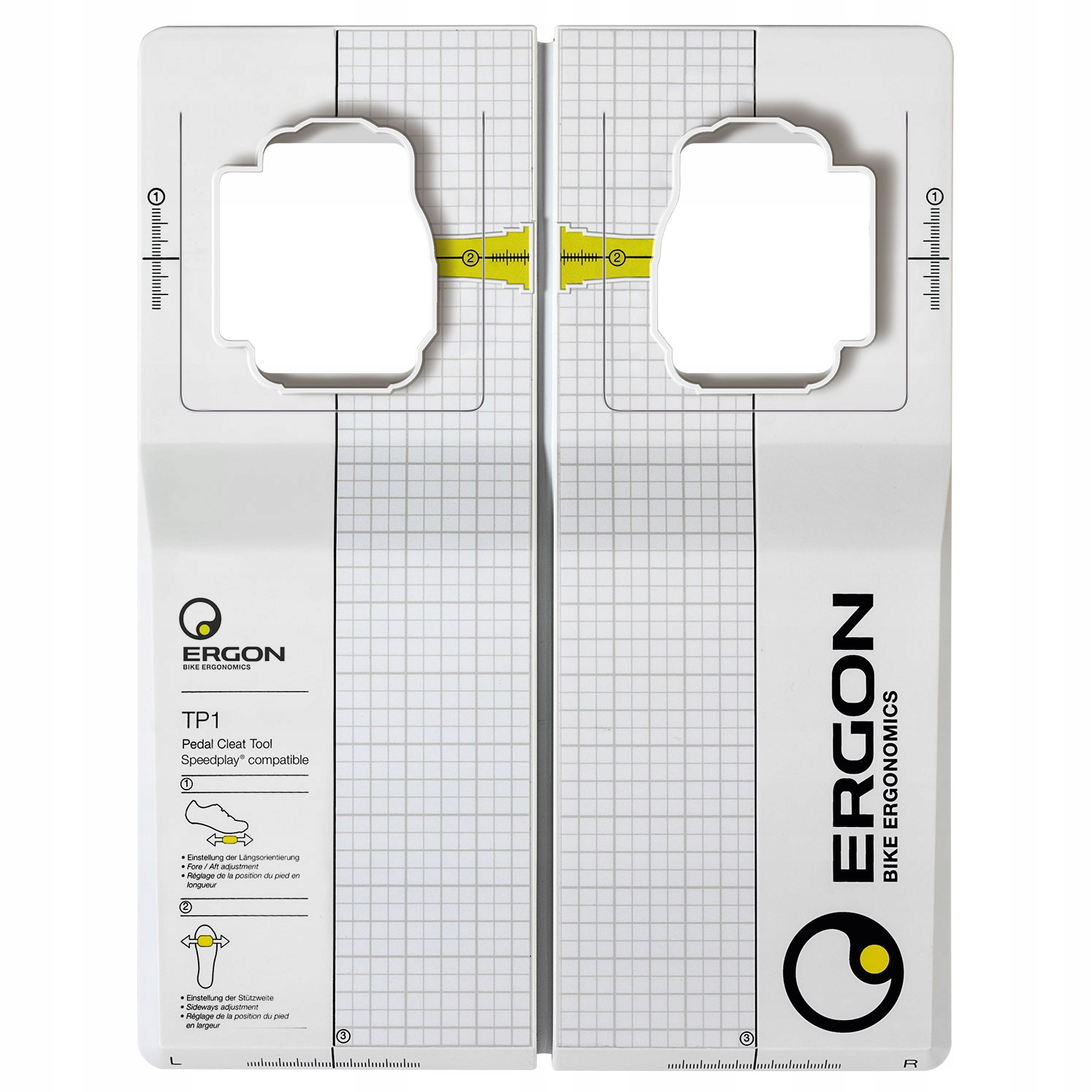 Інструмент Ergon TP1 Pedal Cleat Tool — це шаблон, який дозволяє надзвичайно точно розмістити шипи SPD у вашому взутті. Тепер симетричне розташування шипів в обох черевиках стало дитячою грою. Точне позиціонування можливе завдяки сітці, розміщеній на поверхні шаблону. Завдяки інструменту Ergon TP1 можна значно прискорити збірку блоків у велосервісі, де важливий час і ефективність.