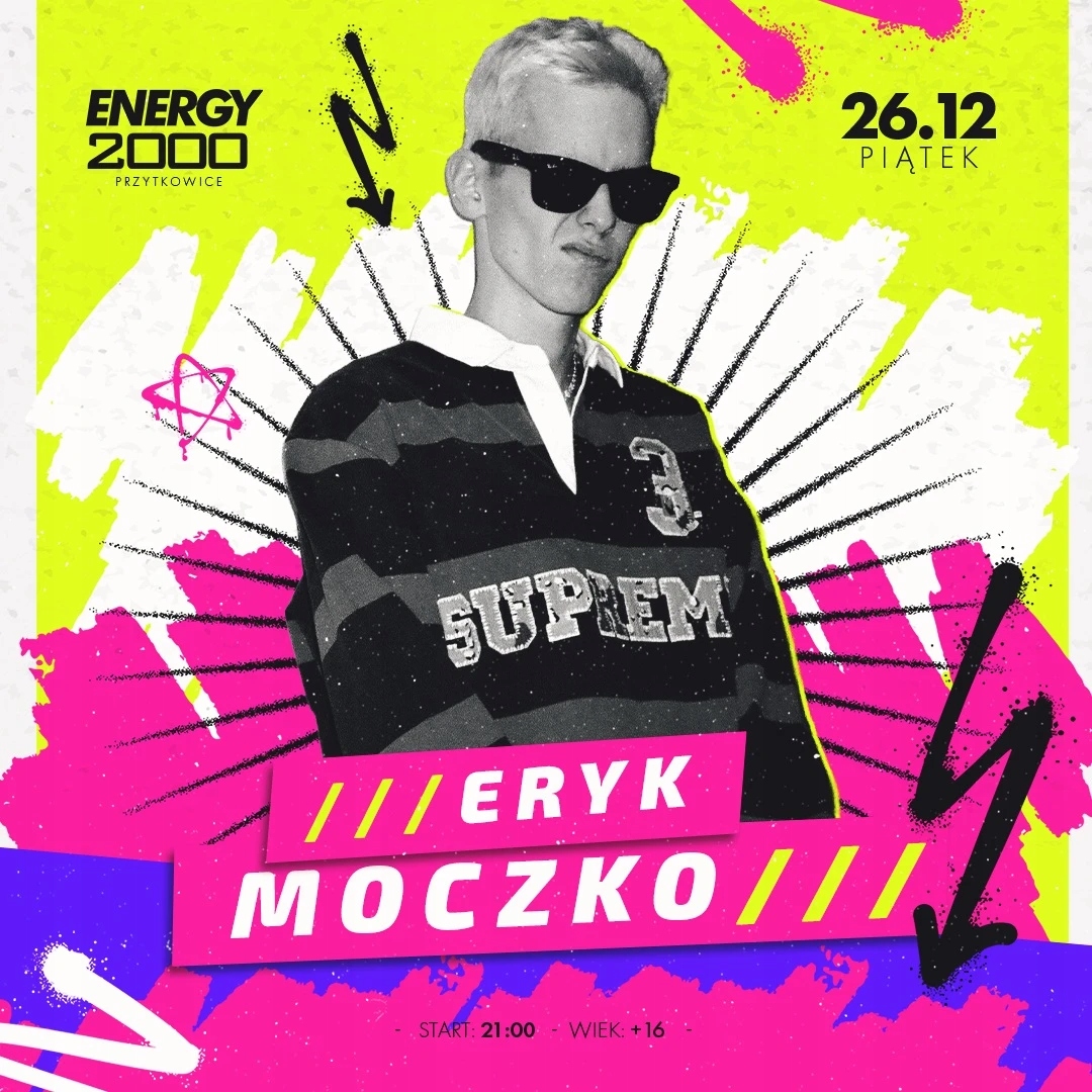 Новорічний подарунок від Енергії 2000! Запрошуємо на унікальний шоукейс з Еріком Мочко - квитки вже у продажу. Вік 16+ Ерік Мочко в Energy 2000 Ерік Мочко – художник, який має мільйони переглядів на стрімінгових платформах і учасник культового DRE$$CODE. Ви почуєте його найкращі хіти - "Nanalone Fanki", "Enzo", "Certificate", "Caroline" та багато інших, які зроблять цю особливу різдвяну ніч ще більш захоплюючою! Приготуйтеся до величезної дози енергії, унікальної атмосфери та святкування разом у найкращому клубному стилі! Розклад подій* Przytkowice Початок: 21:00 Концерт близько 23:15 Катовіце Початок 21:30 Концерт близько 01:30 *Примітка: ці години є приблизними та можуть змінюватися.