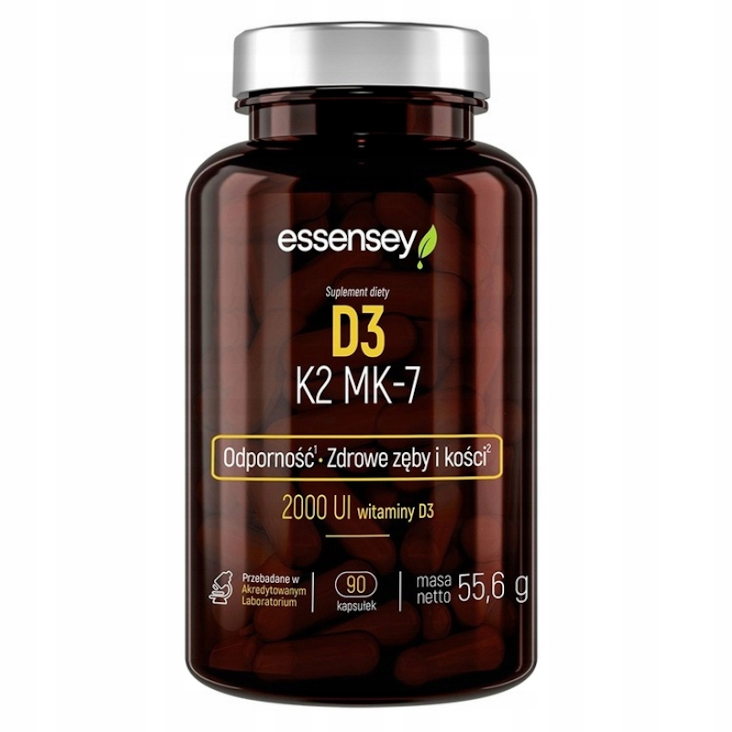 Дієтична добавка ESSENSEY D3 K2 MK-7 містить вітамін K2 і вітамін D3, який підтримує імунітет і допомагає підтримувати здоров’я зубів і кісток2.