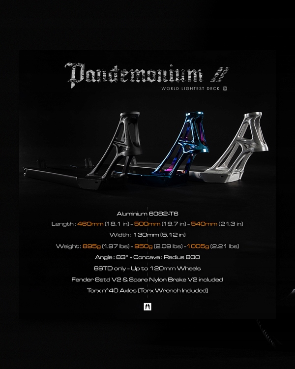 Pandemonium V2 виготовлено з алюмінію 6082 (трохи міцніший, ніж зазвичай використовуваний 6061). Він сумісний з колесами діаметром 120 мм і оснащений новим крилом 8 STD V2 (із системою зміни діаметра) для додаткової легкості.