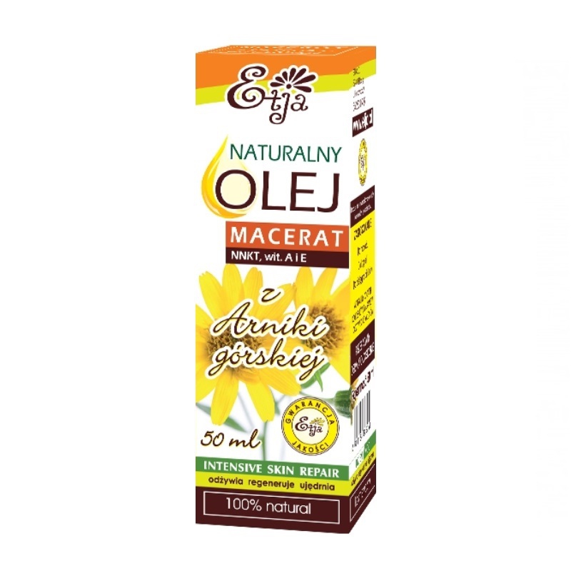 Найякісніший мацерат, отриманий шляхом мацерації квітів арніки гірської в БІО соняшниковій олії холодного віджиму (1:3). Містить кислоти жирні кислоти, мінерали, вітаміни А і Е. Продукт містить кислоту хлорогеновий. Підвищує еластичність, розгладжує і живить. ідеально вбирається, дуже ніжний і залишає шкіру ретельно очищеною гладкий. Завдяки вмісту флавоноїдів покращує кровообіг і розслаблює м'язи. Крім того, масло має антицелюлітні властивості і допомагає бореться з акне, а також підтримує догляд за судинною шкірою. Підходить до всі типи шкіри, особливо ніжна і проблематично.