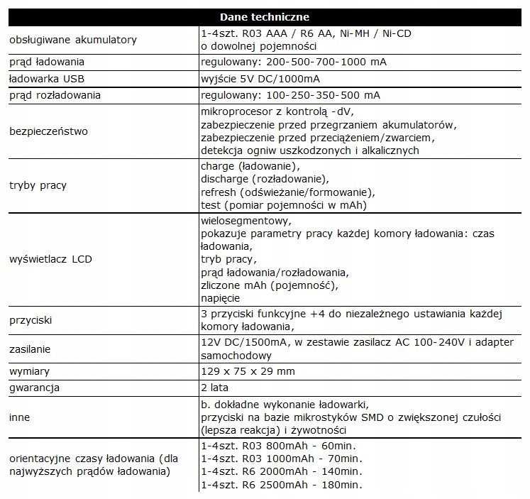 - чотири, повністю незалежні канали зарядки - можливість заряджати 1-4 шт. різні батареї, різні виробники, різна ємність, різні розміри,