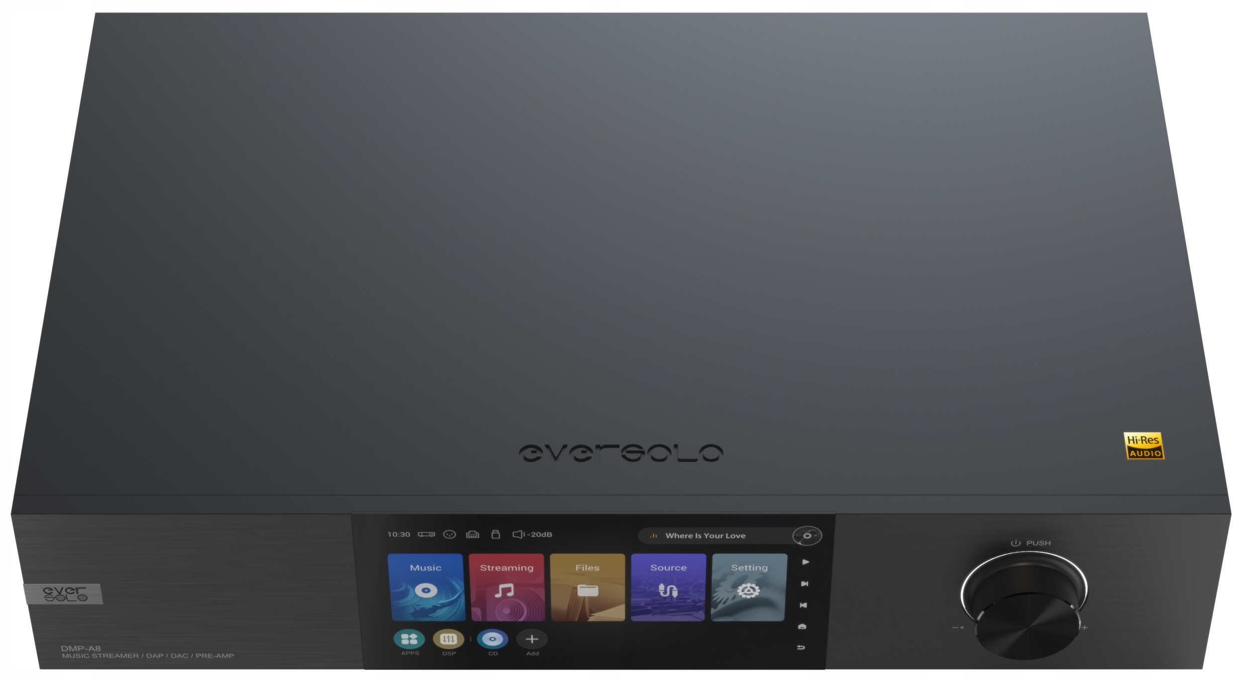 DMP-A8 — абсолютно новий та інноваційний аудіопристрій від EverSolo, який поєднує в собі функції музичного стримера, цифрового аудіоплеєра та цифро-аналогового перетворювача (DAC) і попередній підсилювач (Preamp) - все в одному пристрої.