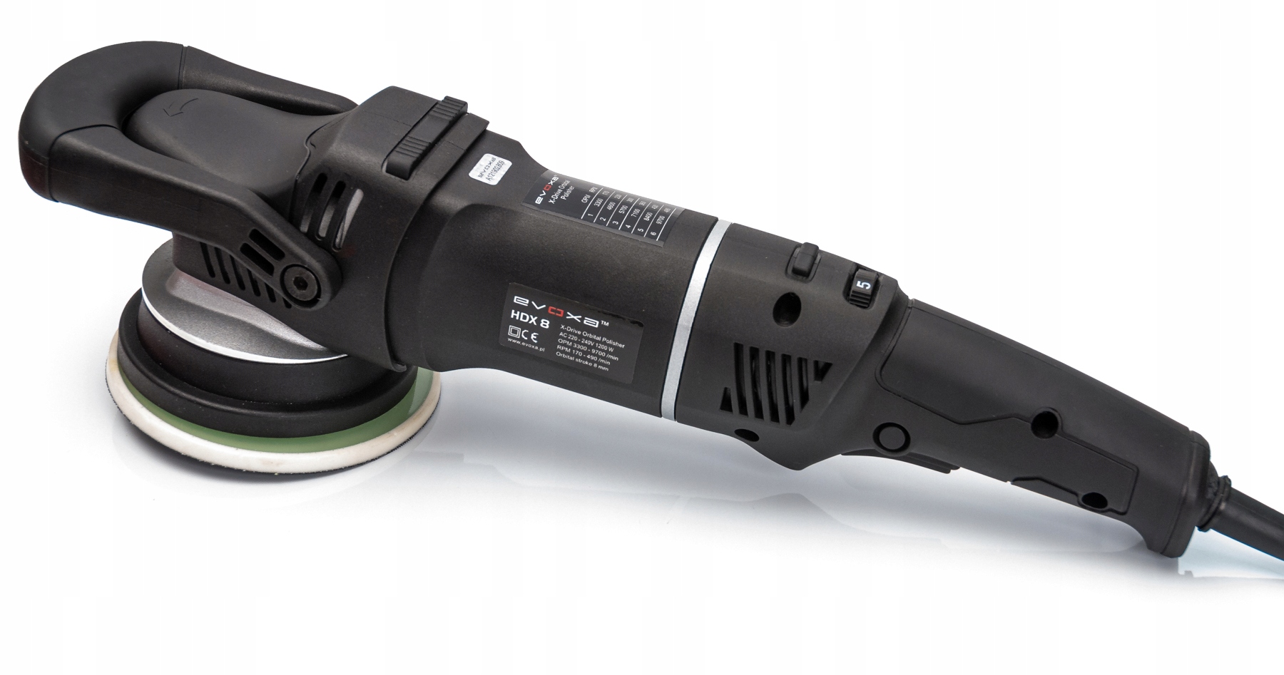 Evoxa HDX8 — це орбітальна полірувальна машина з ходом 8 мм і дуже малою вагою 2,5 кг. Він ергономічний, міцно виготовлений і не пошкоджується. Дуже високої потужності полірувальника (1200 Вт!) достатньо, щоб виправити фарбу за один крок. Ідеально підійде в якості «першої» машини в салоні автодеталізації. Орбітальний рух робить продукт ідеальним для виправлення плоских і криволінійних поверхонь.
