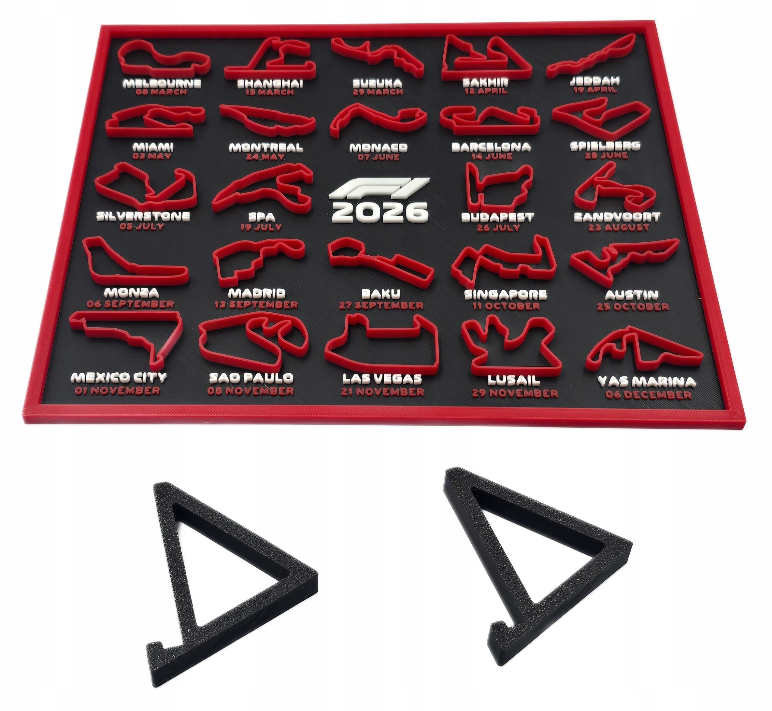 Шукаєте оригінальний подарунок або унікальну прикрасу для фаната Формули-1? Наш просторовий календар є ідеальним вибором для днів народжень, свят чи будь-якої іншої події. Елегантний, тривимірний, сучасний дизайн і ретельна робота роблять його ідеальним доповненням до будь-якої колекції шанувальника гонок F1. Елегантні кольори - класичний чорний у поєднанні з динамічним червоним, доповненим білими акцентами, підійдуть до будь-якого інтер'єру. Усі вихідні Гран-прі 2026 року представлено в повному 3Dрозкладі сезону.
