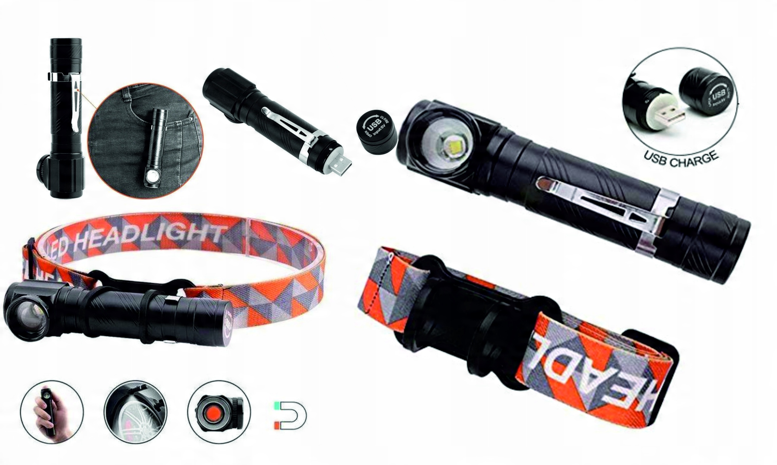 Пропонований нами ліхтарик є комбінацією налобного та стандартного кутового ліхтаря. Має досить непогану потужність 300 люмен в сильному режимі, радіус дії 50 метрів, 3 режими підсвічування, магніт і можливість заряджати акумулятор через USB. Це ідеальний інструмент освітлення для дуже вимогливих туристів, бігунів, спелеологів, скелелазів, рибалок... і, перш за все, любителів виживати та любителів бушкрафту. Він добре працюватиме там, де для виживання важливі невеликі розміри та мала вага. Завдяки невеликому розміру ми можемо сховати його будь-де - навіть у кишені штанів. Ми можемо використовувати його як налобний ліхтарик, ручний ліхтарик, а коли потрапимо в біду, також велосипедний ліхтарик.