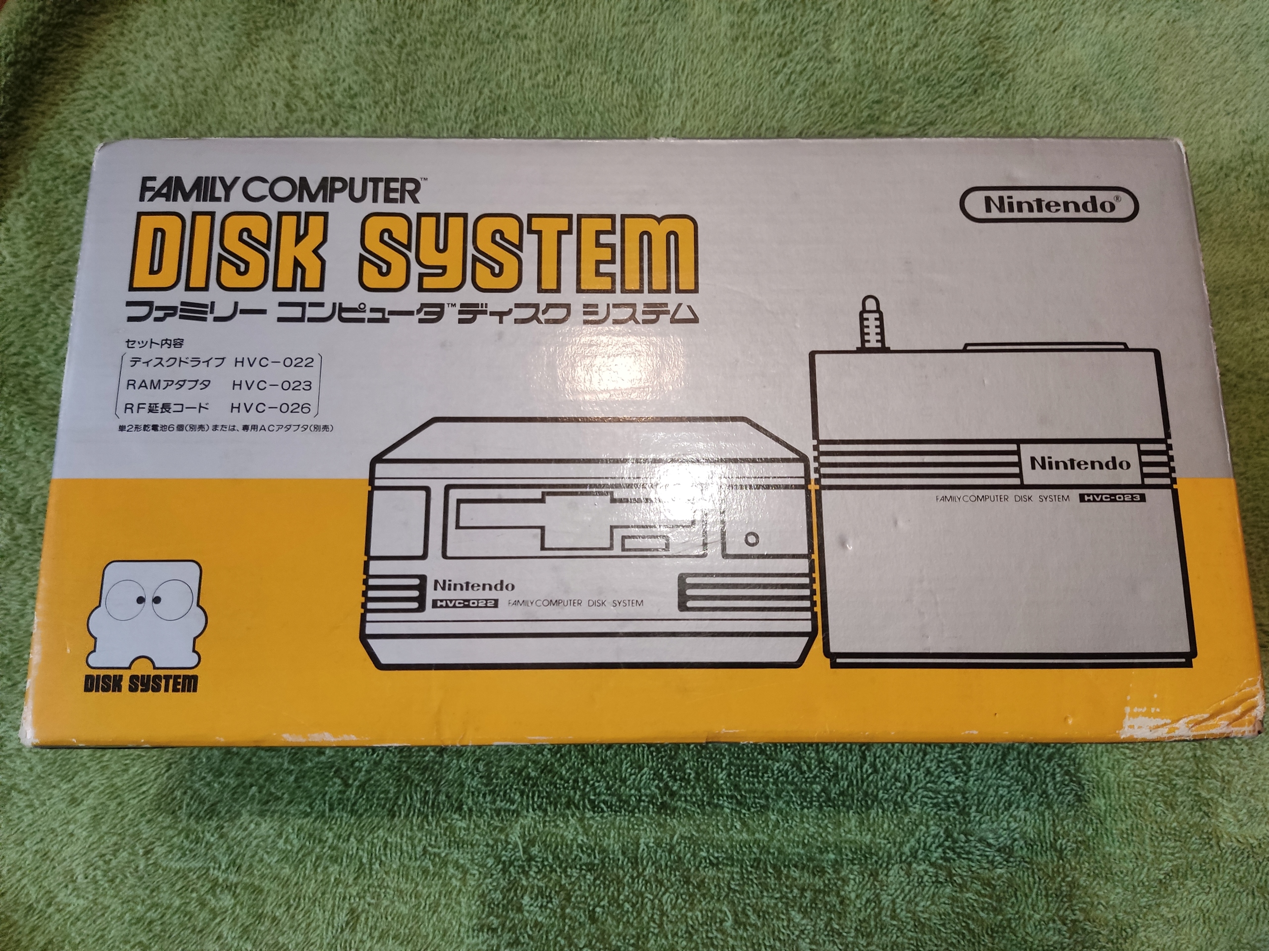 Дискова система Famicom з адаптером оперативної пам’яті, коробкою та іграми Super Mario Bros. і Super Mario Bros.: The Lost Levels.