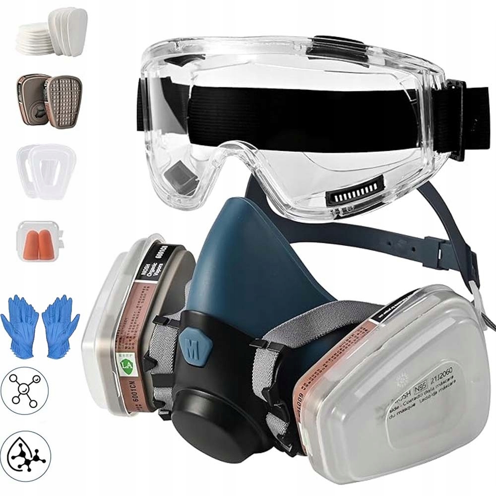 Набір дихання пальців містить 1 дихальну маску, 1 пару фільтрувальних ящиків, 13 фільтрувальників (дві на купі повені), 2 засувки, 1 окуляри, 5 пар рукавичок та пара вушних пробки.