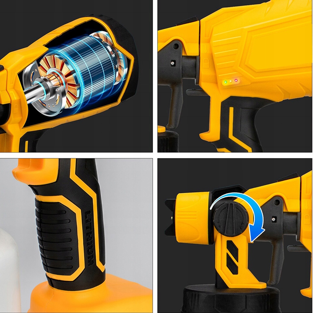 Поральтовані пістолети для внутрішніх фарб оснащені нещодавно вдосконаленою латунною насадкою, яка запобігає пошкодженню, спричиненому падінням або видавленням, не засмічується легко і легко чистити. Контейнер 1000 мл забезпечує достатню кількість фарби для більш тривалого обприскування, не часто поповнюючи. Оснащений 2 акумуляторами, які повністю завантажені всього за 2-3 години, що значно підвищує ефективність роботи.