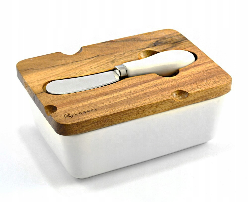 Масленниця простої сучасної форми в поєднанні з кришкою з акації та ножем для масла виглядає унікально та вписується в будь-яку обстановку.