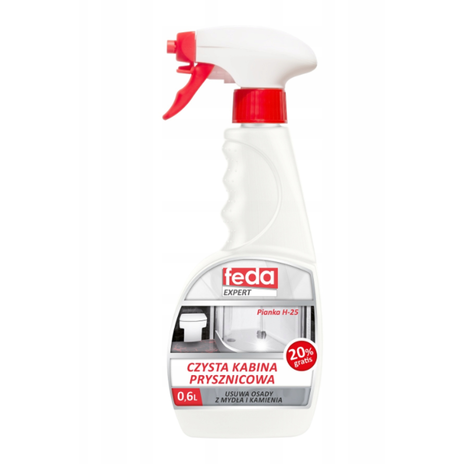 CLEAN SHOWER CABIN Feda Expert - це високоефективна очищувальна піна, призначена для щоденного очищення душових кабін, арматури та інших поверхонь ванних кімнат. Завдяки сучасній формулі ефективно видаляє накип, мильні та косметичні відкладення, залишаючи поверхні блискучими, чистими та без розводів - все це без стирання та ризику подряпин.