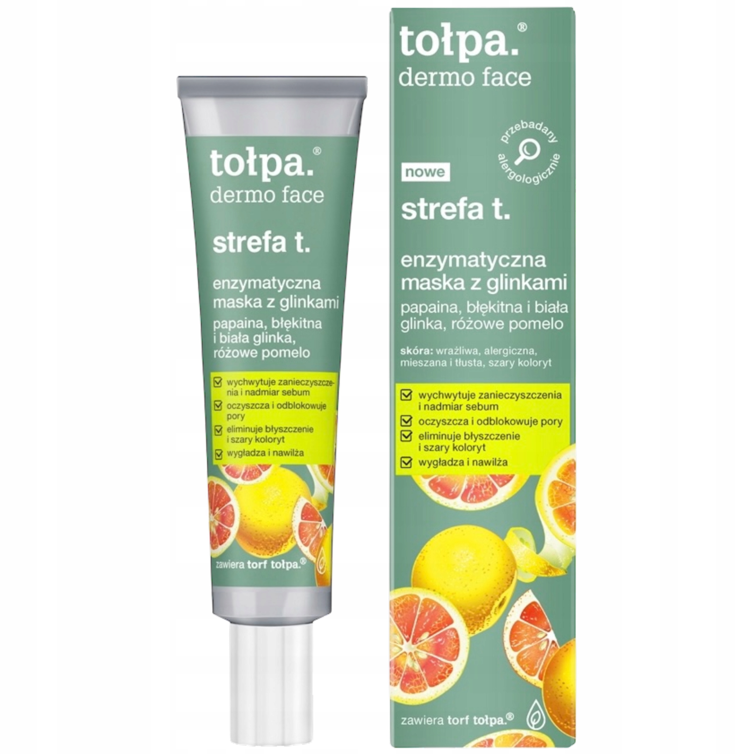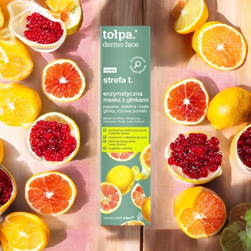 Tołpa Dermo Face Z Zone T ферментативна глиняна маска - це інноваційна дермокосметика, що поєднує переваги ферментативної лущення та глиняної маски. Акуратно відлущує мертву шкіру без частинок і потребу втирати, фіксує домішки, видаляє зайві шкірні сала і розблокує пори. Шкіра після використання глибоко очищається, розгладжується, зволожується і матується. Продукт усуває сірий колір, зменшує блискучий і підтримує боротьбу проти недосконалостей та вугрів