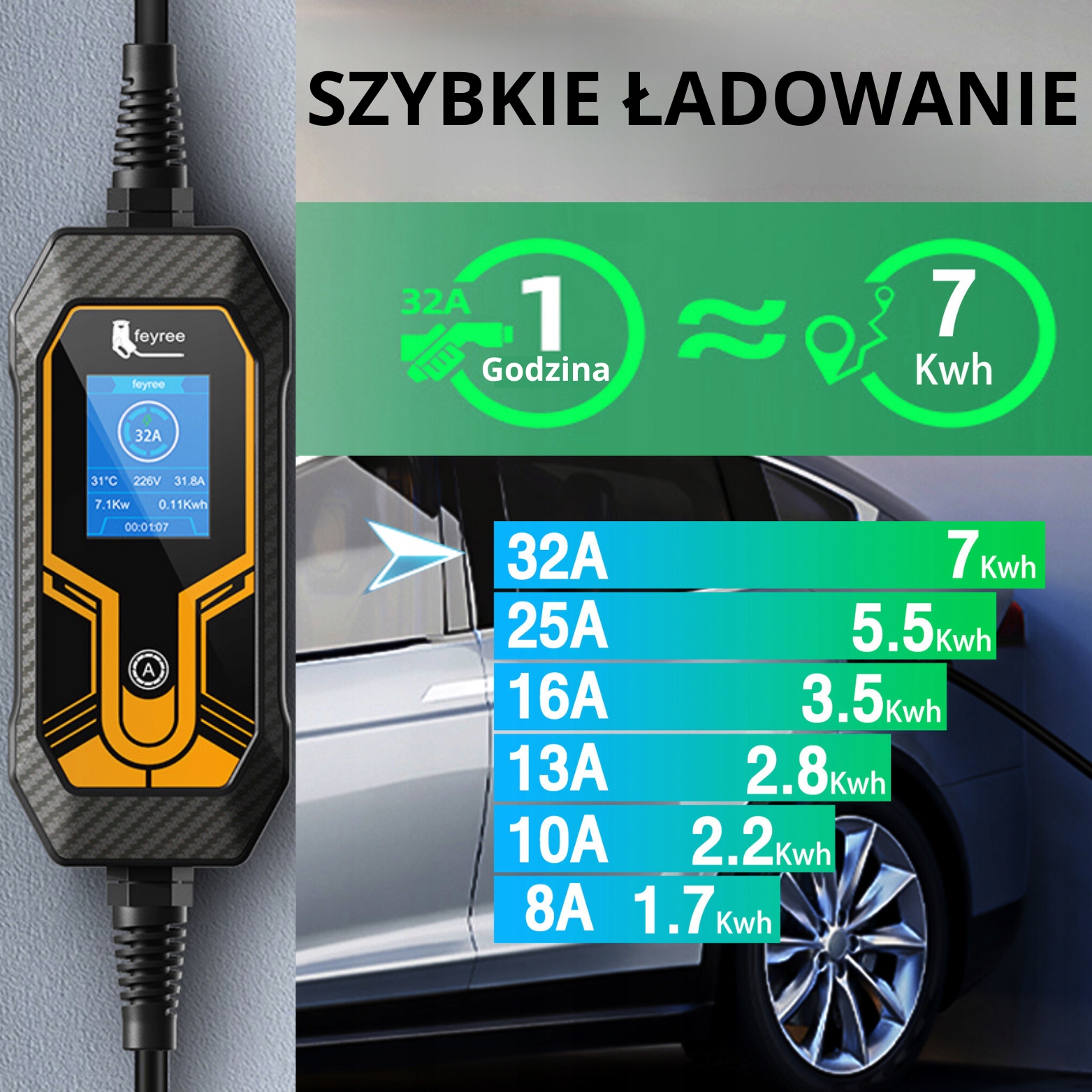 - Швидка зарядка: продукт, розроблений таким чином, щоб заряджати транспортний засіб швидкий і неприємний. Довгий 5 -метровий кабель забезпечує зручність використання як у гаражі, так і на проїжджій дорозі Мобільність: вам не потрібно турбуватися про зарядку під час подорожі, оскільки наш зарядний пристрій можна взяти на автомобільну подорож, а будь -які дані про зарядку можна перевірити на РК -дисплеї зарядного пристрою. Вам потрібно лише підключити його до розетки CEE