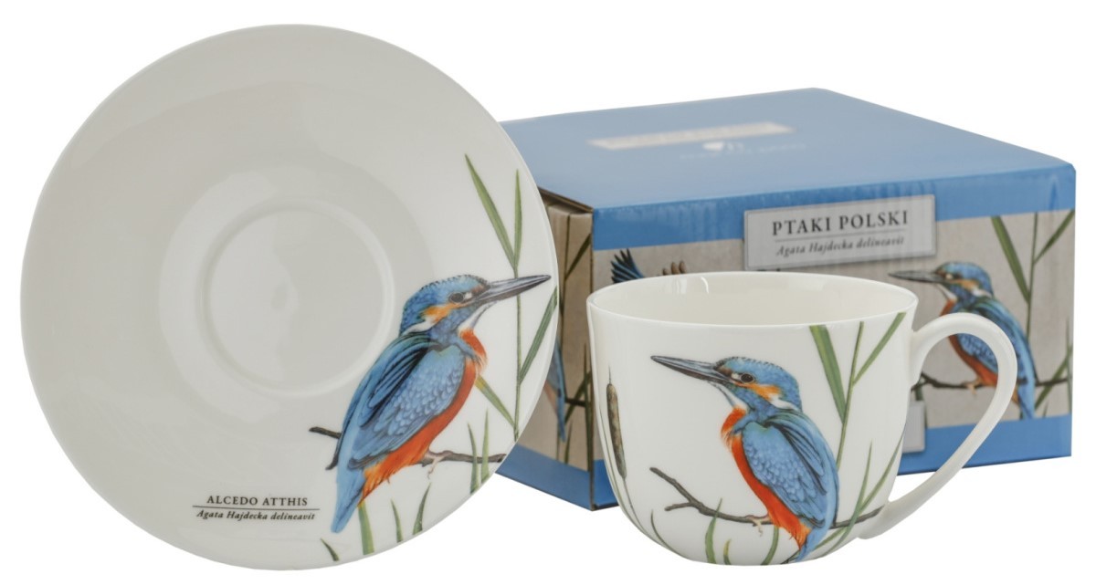 Набір із чашки та блюдця із серії Polish Birds від Agata Hajdecka, виготовлений із високоякісного фарфору — невеликої ваги та ідеального білого кольору від Marco Polo. Набір прикрашений мотивом звичайного зимородка на білому фоні.