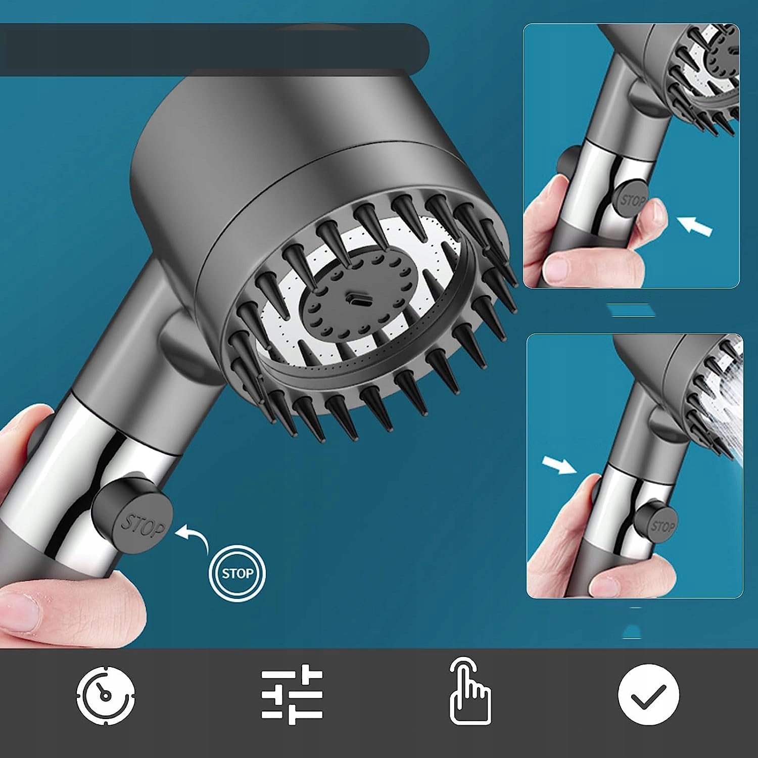 -Цей душ доступний у режимі розбризкування (заспокійливий і ніжний), режимі дощу (м’яка вода), режимі змішування (сильний пульс) і режимі полоскання (зніміть насадку).