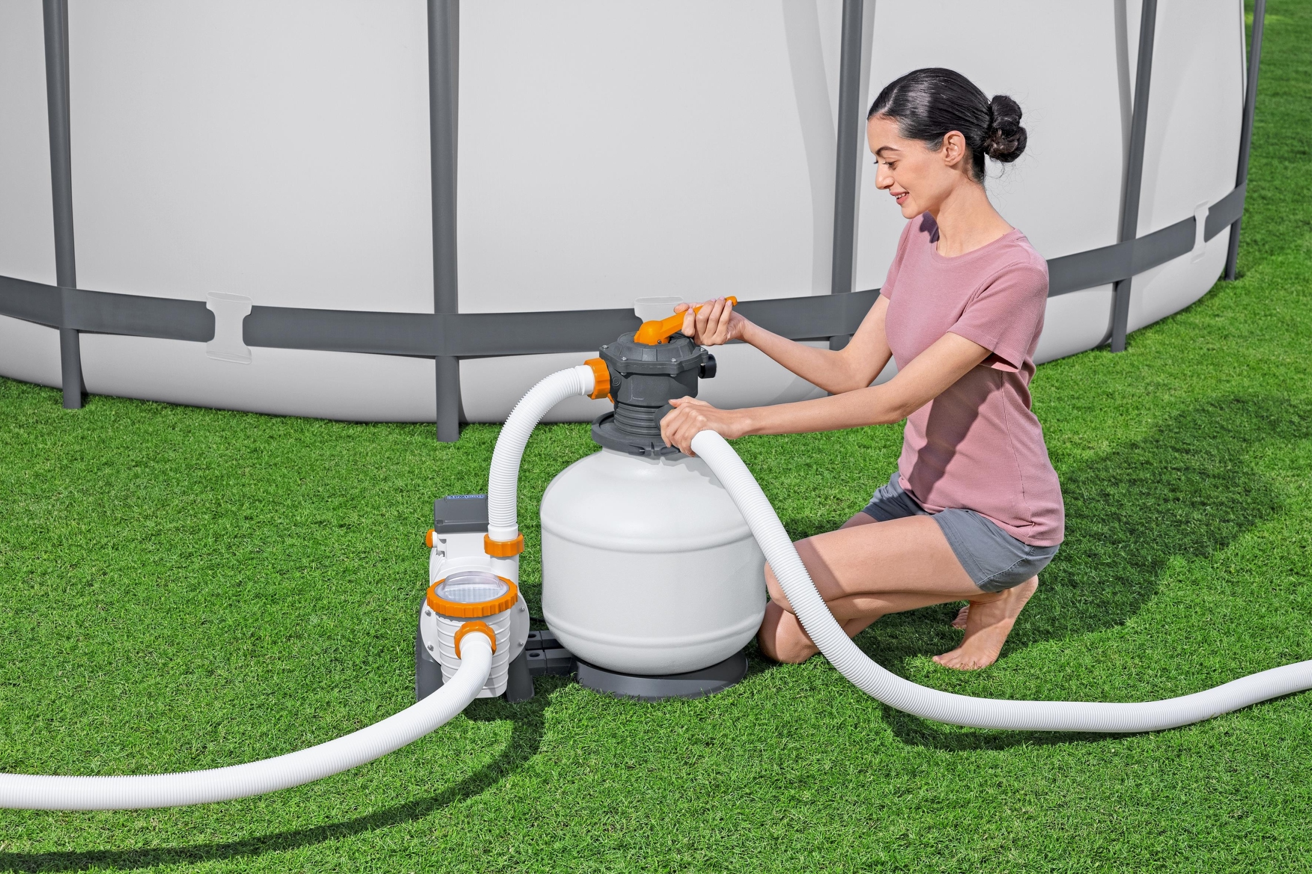 Накос пісочного фільтру Bestway® - це високоефективний та екологічно чистий спосіб зберегти чисту воду, що протікає через наземний басейн. Це вигідне рішення, оскільки насос використовує кремнеземний пісок замість традиційної вставки фільтра. Хоча традиційні картриджі слід замінювати кожні 2 тижні, кремнеземний пісок достатньо протягом 3 років. Пісок ловить бруд і домішки, але танк перед -філтер фільтрує більші речі, завдяки якому насос триватиме довше. Продукт зібраний на фабриці і сумісний з більшістю наземних басейнів з потужністю від 1100–6600 л, оскільки він оснащений адаптерами для клапанів пулу із зовнішнім діаметром 3,8 см.