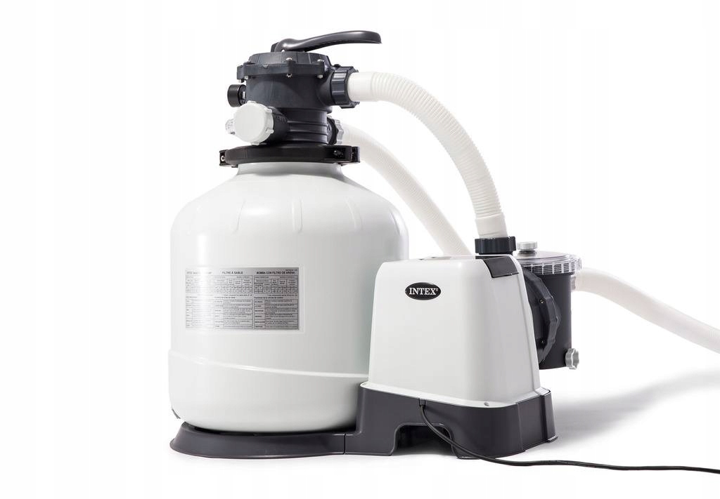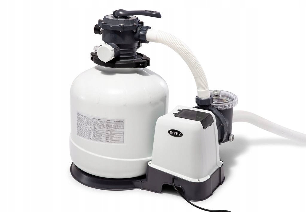 фільтрація піску Intex для наземних басейнів. Пристрій Фільтрування складається з пластикової основи, фільтрувального контейнера Від поліпропілену без швів, 6-стринтовий клапан, пістолет і насос. Контейнер Фільтр підключений до насоса з гнучкою змією.