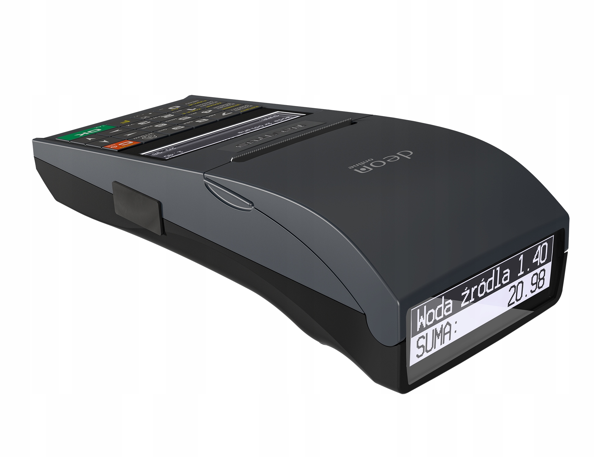 DEON Online має дуже ефективний акумулятор - без зовнішнього живлення він може надрукувати до 3000 квитанцій. Durkarka може спілкуватися, серед іншого: з ЦРК, комп'ютер, ваги, сканер, платіжний термінал. Клавіатура виготовлена з силікону, який захищає електроніку від забруднення або випадкового пролиття. DEON Online має можливість друкувати графіку в заголовку квитанції, програмувати назву продукту до 40 символів і друкувати ідентифікаційний податковий номер покупця на квитанції.
