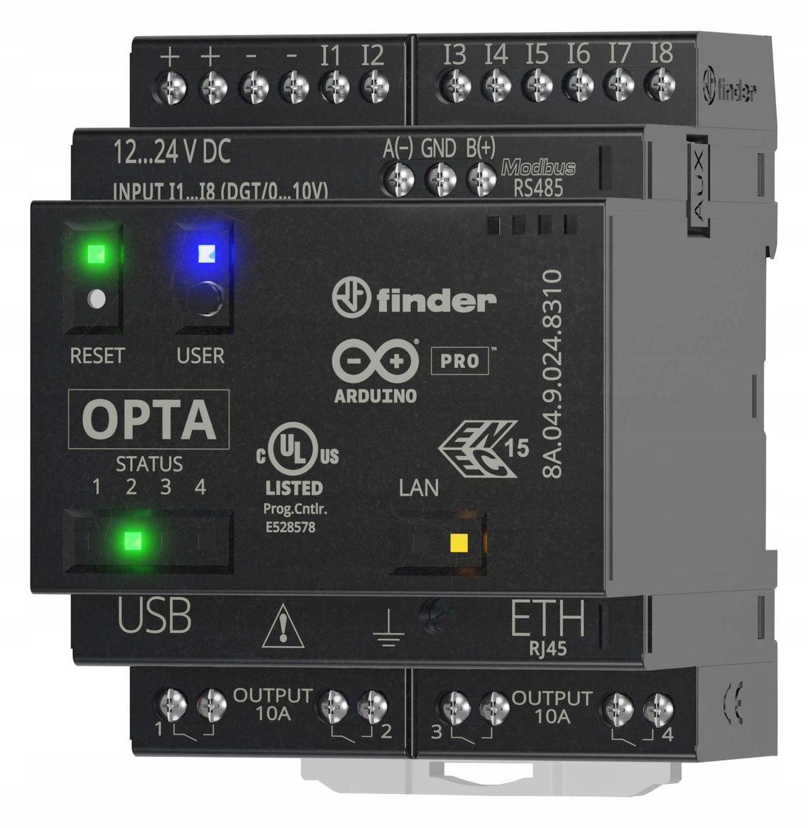 OPTA PLUS. Ряд простих і автономних ПРОГРАМОВАНИХ ЛОГІЧНИХ РЕЛЕ, ідеальних для простої промислової автоматизації, автоматизації будівель OEM та IoT. Програмується за допомогою звичайних мов програмування (схема сходової логіки), а також інноваційних мов програмування з відкритим кодом (IDE - ARDUINO). Ефективна двоядерна система Cortex M7+M4 дозволяє виконувати велику кількість обчислювальних процесів у реальному часі. Завдяки високоякісній інтегрованій мікросхемі Secure Element ви можете керувати шифруванням і ключами даних у всіх типах програм. Напруга живлення 12...24 В постійного струму, 8 аналого-цифрових входів (0-10 В-12-24 В), 4 релейних виходи (замкнути контакт, 10А), швидкий роз'єм USB (тип C) для програмування та живлення під час конфігурації, збору даних (через носій даних), порт Ethernet RJ45 (Modbus TCP-IP) і порт RS485 для підключення MODBUS RTU.