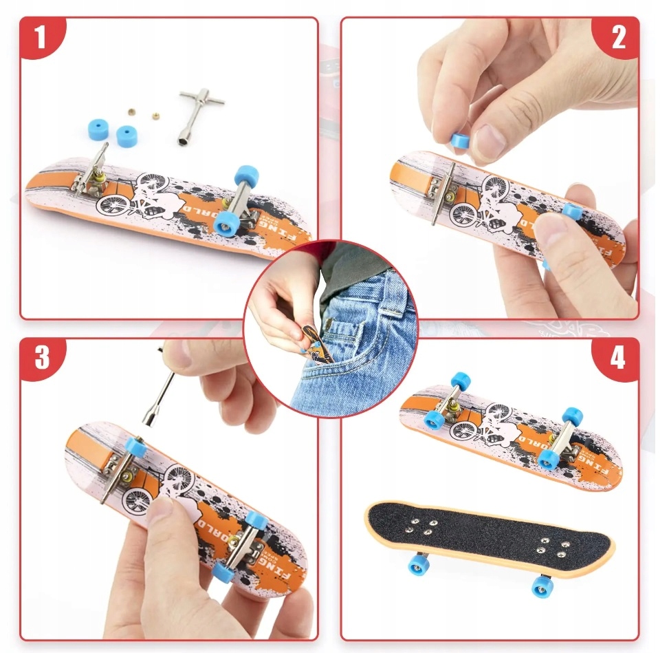Дескороли виготовлені з високоякісних матеріалів і мають металеву доріжку і покриті поверхнею anti -slip, що нагадує реальну структуру скейтборду, , щоб пальці не ковзали на дошці під час гри та дозволяють краще їздити та контролювати під час виконання. Скейтборд є складним і готовий до гри. У упаковці запасні колеса та аксесуари для їх складання супроводжуються у кожному з них.
