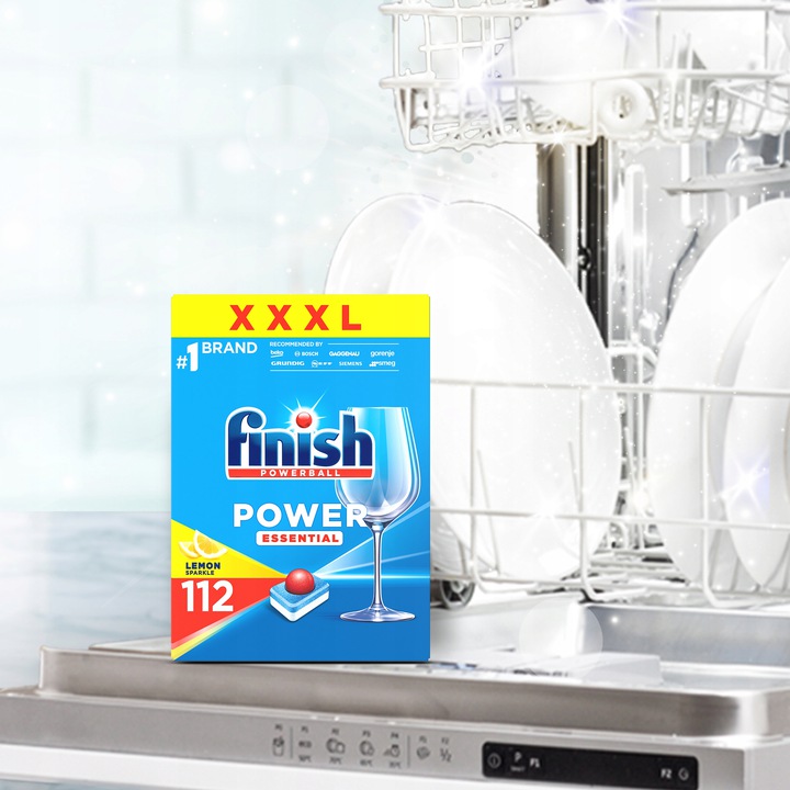 Finish Power Essential Lemon tablets діють як сіль і ополіскувач і діють навіть за низьких температур. Вони ефективно очищають посуд і залишають свіжий аромат.