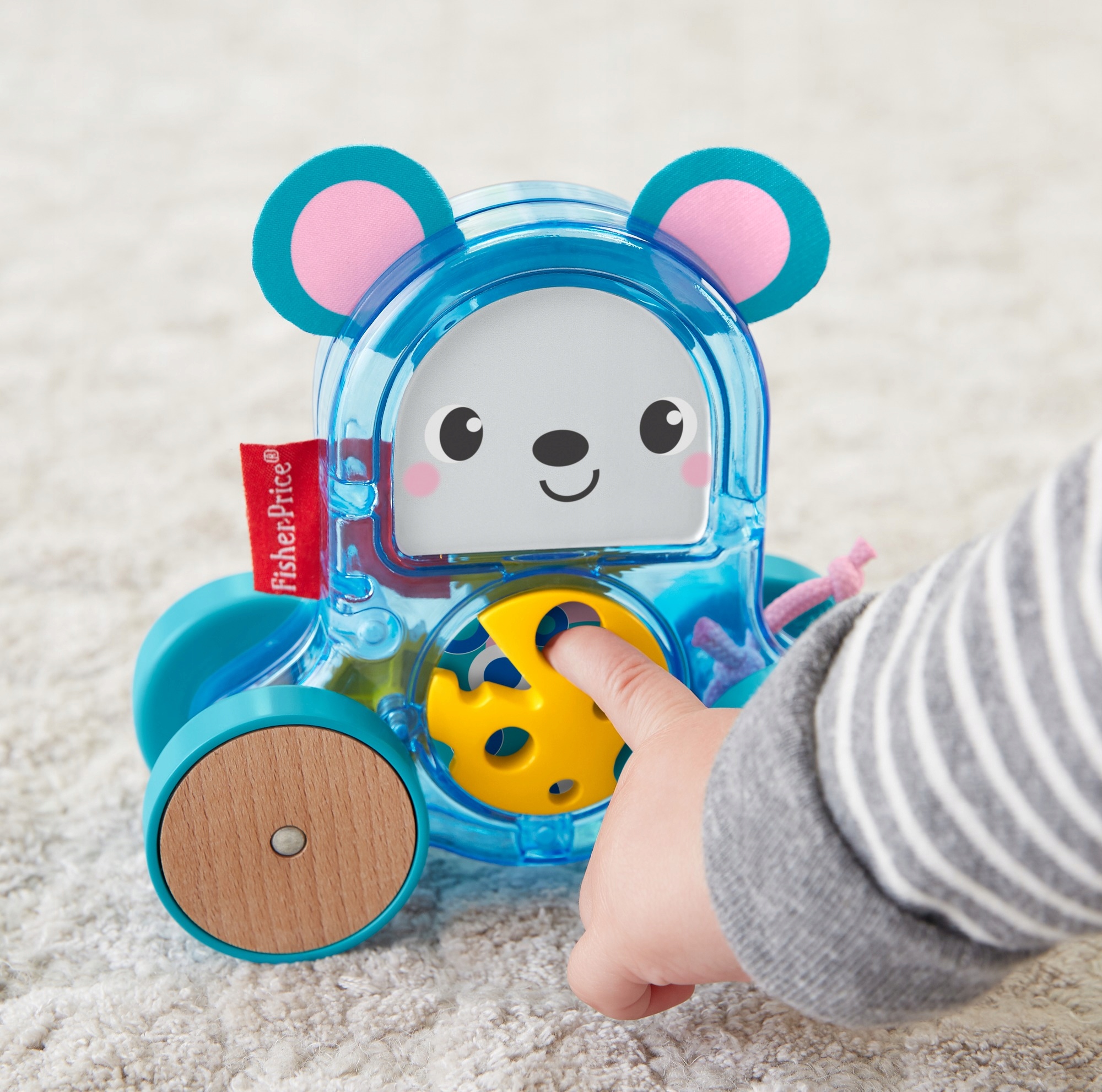 Барвисті тварини Фішер-ціна Транспортні засоби відповідають маленькими ручками, щоб дитина могла легко схопити їх і штовхати їх під час гри в сидіння та повзання. Сир. Тварини! Поспостерігайте за рухомими передачами, коли транспортний засіб продовжується.