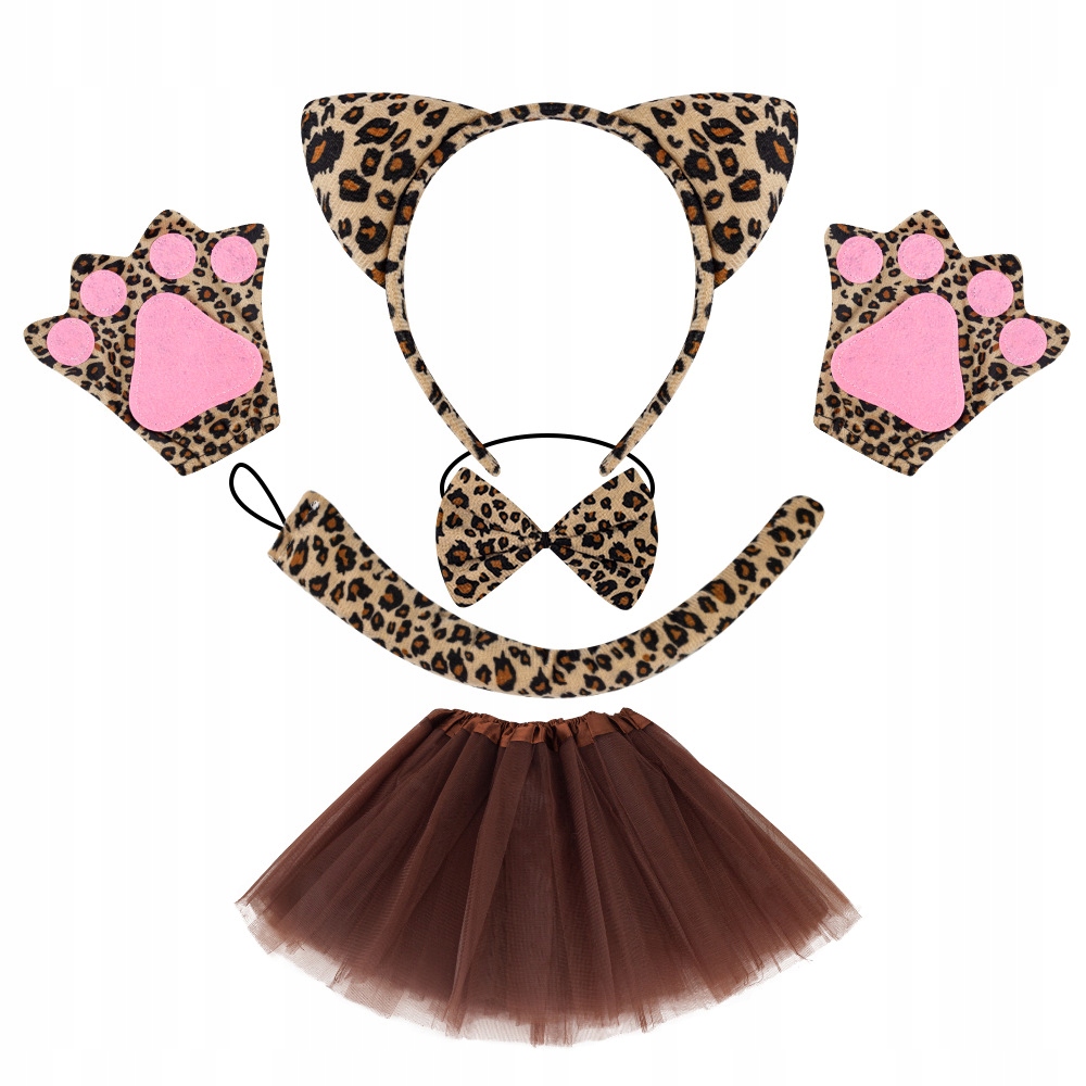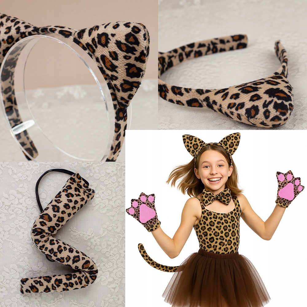 Пов'язка з вушками, довгий хвіст, рукавички у вигляді лап і краватка-метелик - всі елементи виготовлені з матеріалу з модним леопардовим візерунком. Завдяки їм наряд виглядає ефектно і дозволяє дитині зіграти роль маленького, але чарівного кошеняти.