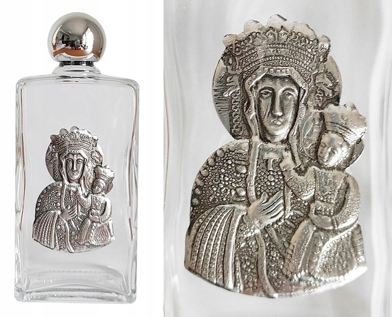 - На пляшці зображено Діву Марію з Немовлям, св. Сім'я, Ісус Христос, Пречиста Богоматір чи Ченстоховська з металу. Зроблено в Італії - надзвичайна увага до деталей;