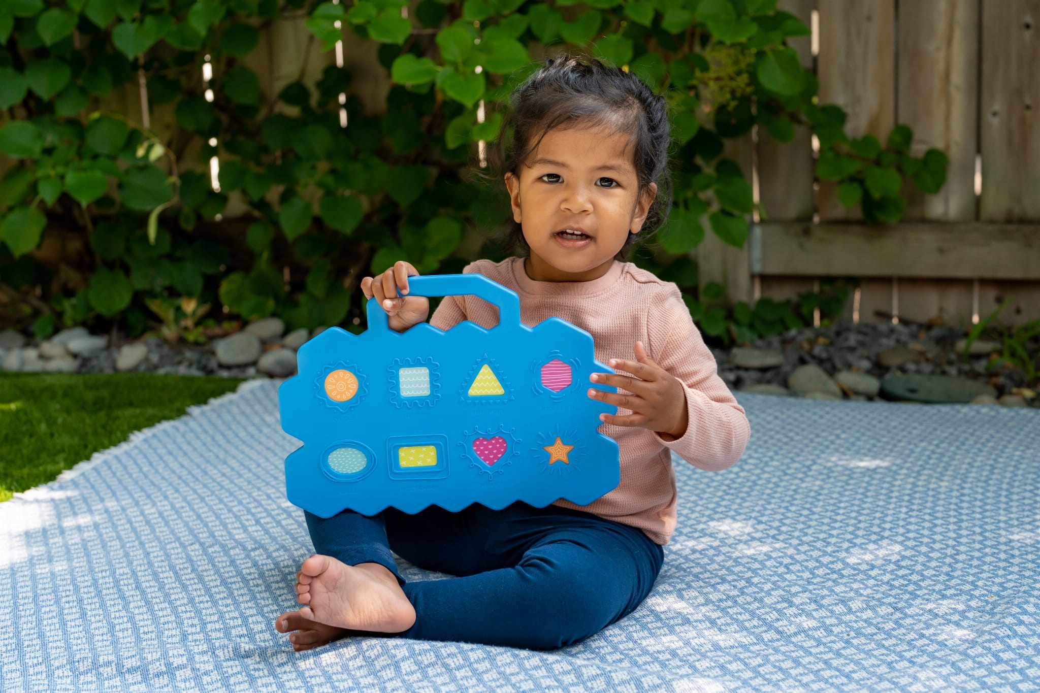 Дошка має ручкутому дитині зручно брати її куди завгодно. На зворотному боці дошки є позначені кольорові фігури, які дитина може накривати та торкатися.