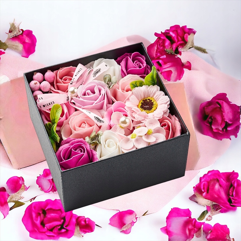 Подарунок у вигляді квіткової коробки з композицією з мильних квітів ідеально підходить до Дня Святого Валентина, Жіночого дня, Дня Матері, Дня Бабусі, Дня Дідуся , День батька, Різдвяний подарунок, подарунок, як альтернатива живі квіти, подарунок на весілля, подарунок співробітникам, як подяка гостям, подарунок на День вчителя, подарунок на день народження, подарунок для подруга або кохана людина. Це буде відмінна ідея замість букета і не зів'яне, як живі квіти. Альтернативою вічним трояндам є композиція з квітів і мильних троянд. Вічні троянди як мильні квіти підходять для ванн, як прикраси або як подарунки для співробітників. Чудово підійде як доповнення до подарунка.
