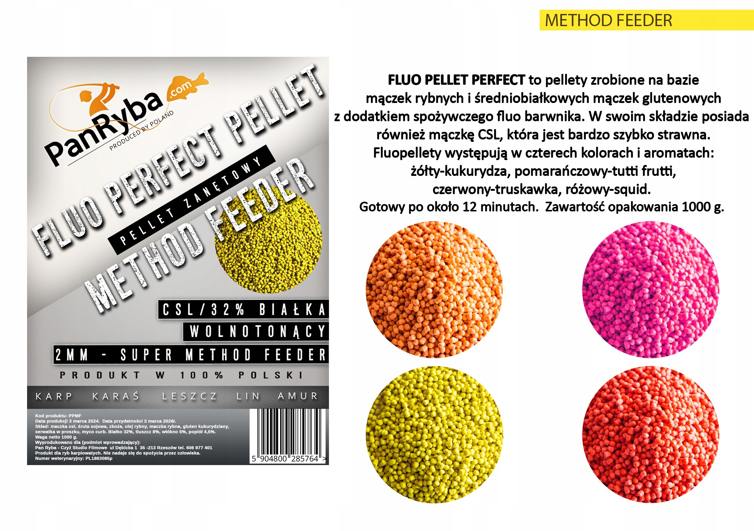 Флуо-гранули — це гранули розміром 2 мм, виготовлені з борошна середнього білка з додаванням харчового барвника фтор. Вони дуже добре працюють і швидко розпадаються. Вони відмінно маскують приманку подібного кольору. Ми рекомендуємо занурити його у воду або полити приблизно на 60 секунд. Він повністю готовий до використання через 20 хвилин. Вміст упаковки 1000 г.