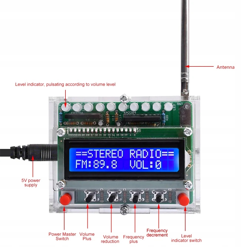 Основне управління складається з мікросхем STC89C52 і 5807. Інформація про смуга частот відображається в реальному часі на екрані LCD1602.