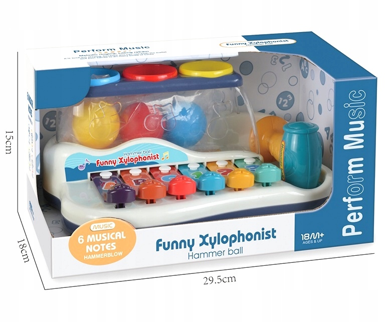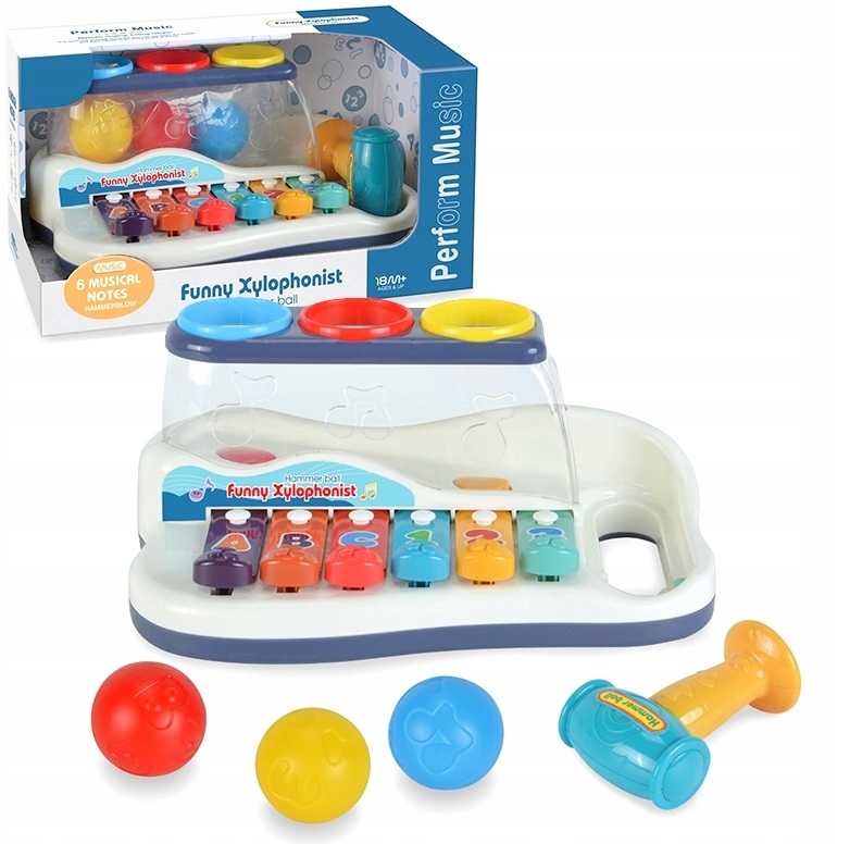 - Набір включає три різнокольорові кульки, які під час удару молотком створюють різноманітні звукові ефекти та, потрапляючи в боковий жолоб, додатково спонукають дитину продовжувати гру.
