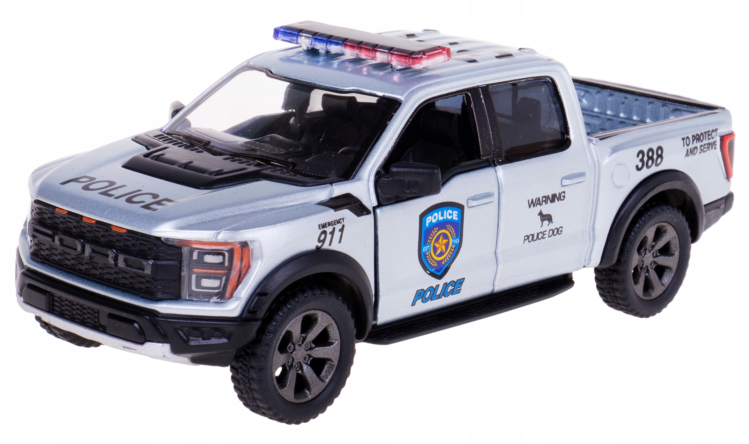 FORD F-150 RAPTOR POLICE 2022 року випуску з металу та пластику в масштабі 1:46 із приводом Pull Back від KINSMART.