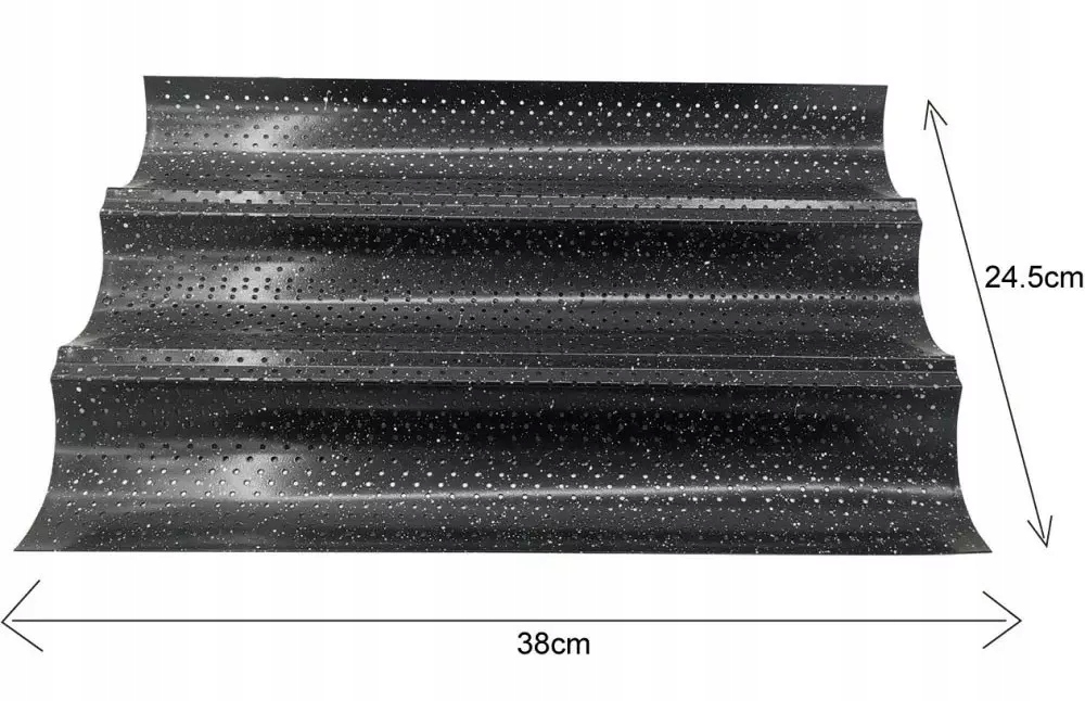 Відкрийте для себе нашу форму для багетів розміром 28 x 24,5 см, яка ідеально підходить для випікання хрустких і смачних багетів у французькому стилі. Виготовлений з високоякісного матеріалу, він швидко нагрівається і рівномірно розподіляє тепло, забезпечуючи чудову ефективність випічки. Його антипригарна поверхня полегшує випікання та чищення. Особлива форма та перфороване дно зроблять ваші багети надзвичайно хрусткими зовні та м’якими всередині. Замовте цю форму зараз і насолоджуйтесь автентичним смаком багетів на своїй кухні, кожен шматок яких перенесе вас у Париж.