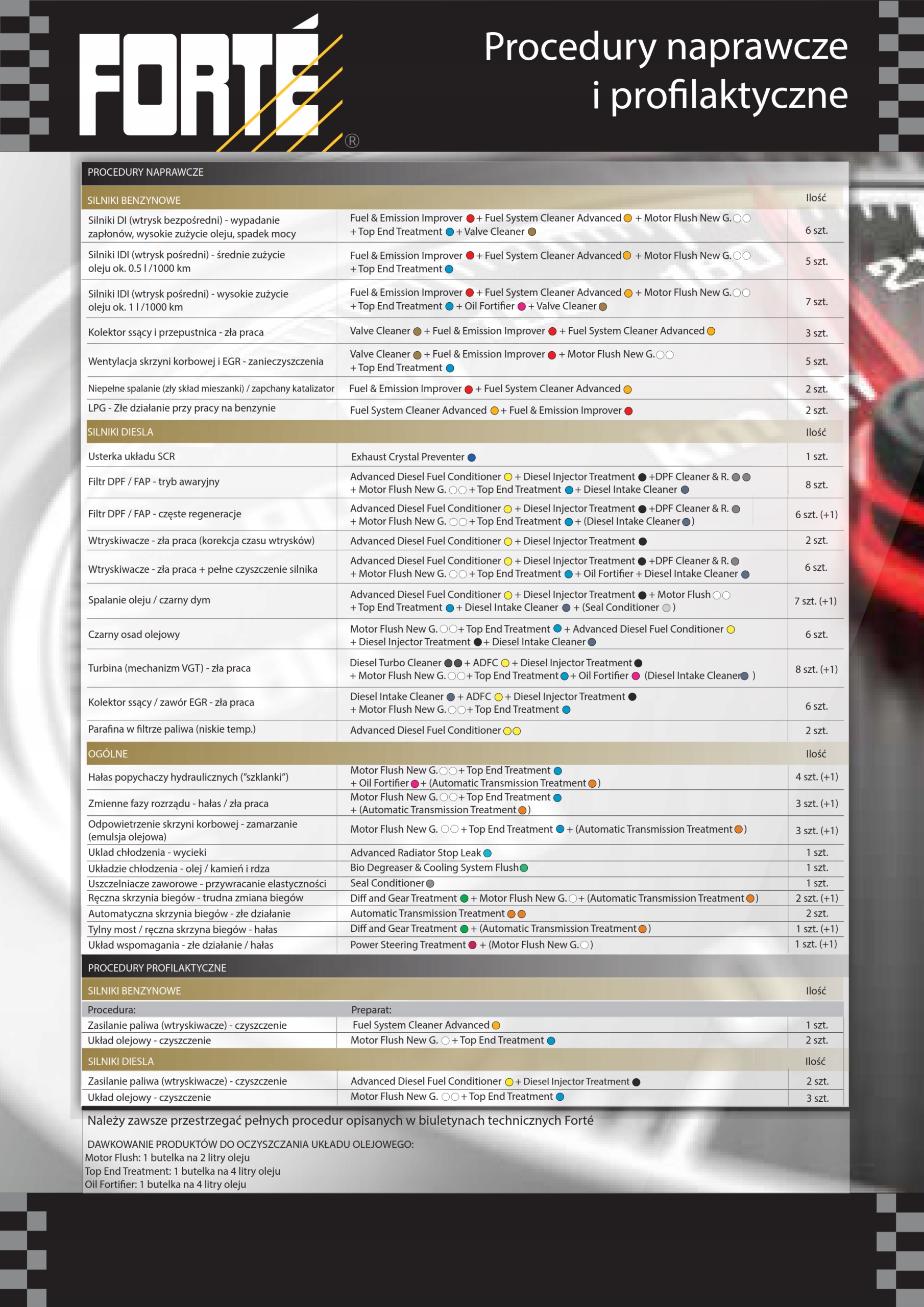 Додайте 1 x 400 мл Forté Diesel Turbo Cleaner разом з однією дозою Forté Advanced Diesel Fuel Conditioner до максимум 100 літрів палива або 0,4% об’єму бака.