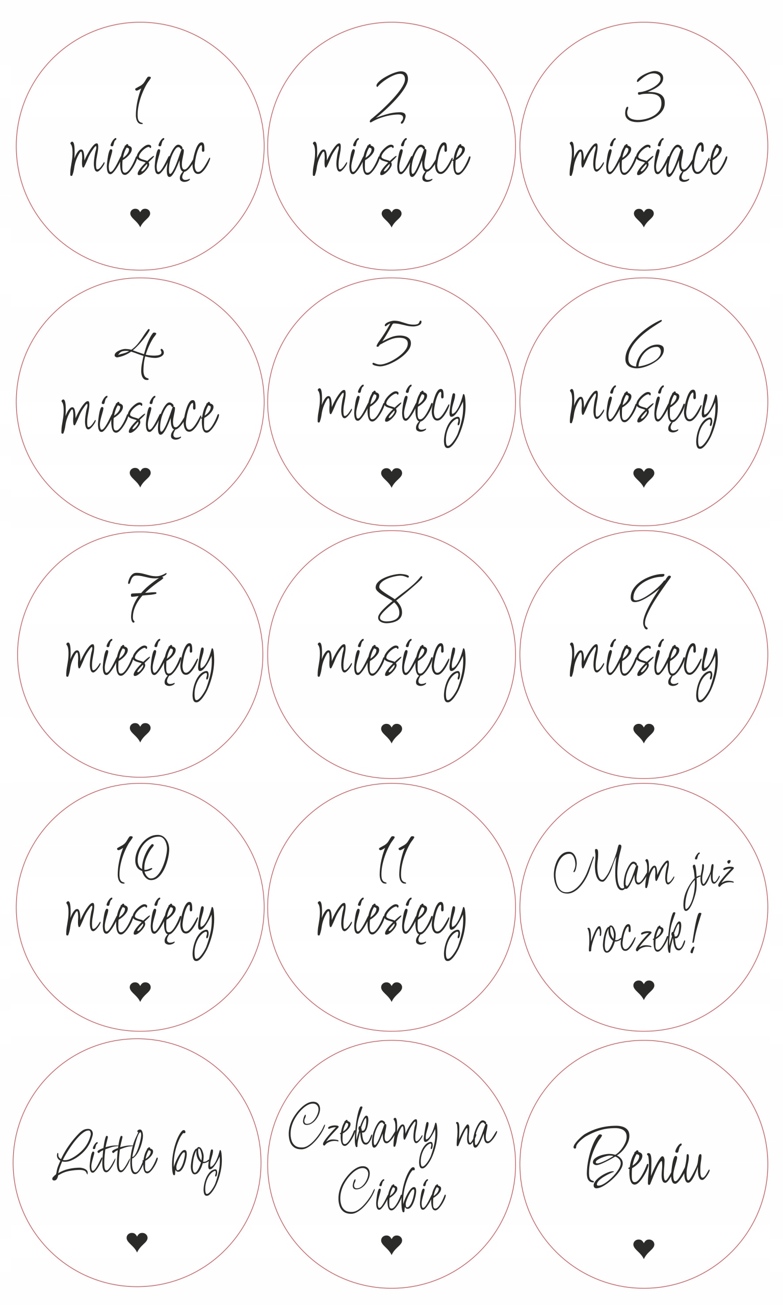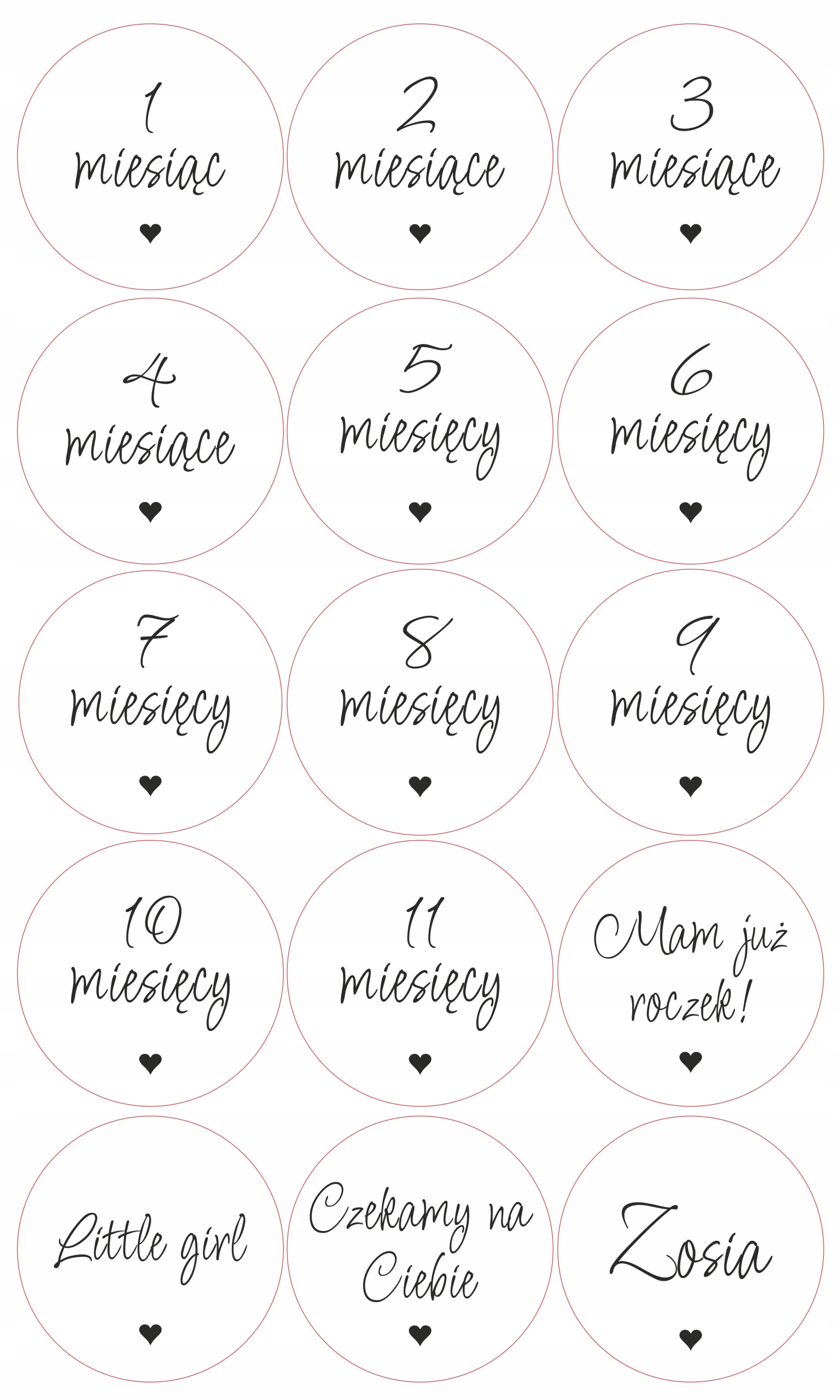 Діски мають діаметр 9,5 см. У наборі 15 дисків: місяців від 1 до 11, Мені вже рік, Дівчинка чи Хлопчик, Чекаємо на Вас, Ім'я дитини.