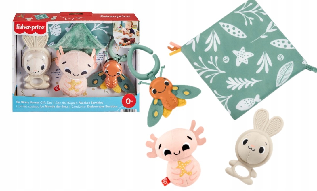 Подарунковий набір Fisher-Price The World of the Senses із 4 іграшками для активації та розвитку спритності для новонароджених Новонародженим сподобається сенсорна гра з цим подарунковим набором World of the Senses від Fisher-Price®. У набір входить 4 іграшки, такі як зайчик-прорізувач без бісфенолу А з висувною кулькою, м'який аксолотль з дзвіночком, брязкальце від молі з цікавою текстурою та м'яка шуршача панель зі стрічкою. Чудові іграшки для активного відпочинку, які легко тримати в маленьких ручках, допомагають тренувати спритність і розвивати зір, слух і дотик вашої дитини. Панель із мотилем і шелестом можна легко прикріпити до ігрового килимка, сумки для пелюшок або коляски за допомогою тримача, тож ви можете насолоджуватися ними навіть у дорозі. Набір поставляється в декоративній упаковці, ідеально підходить для свята дитини.
