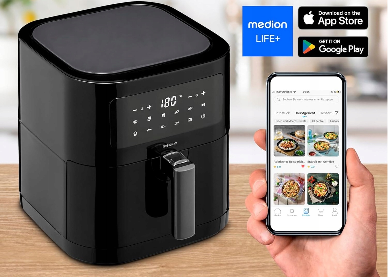 Свіжа картопля фрі, повітряні та смачні чізкейки чи хрусткі курячі нагетси - з цією сучасною фритюрницею E40 XL від MEDION ви зможете досягти всього цього та багато іншого. Кухонний помічник є універсальним кулінарним інструментом і дозволяє готувати численні рецепти в одному пристрої. Ви смажите рибу на грилі, смажите котлети і стейки, печете рулетики для сімейного сніданку і багато іншого. Ваша фантазія не має меж, тому що ця універсальна фритюрниця може набагато більше, ніж класична фритюрниця!