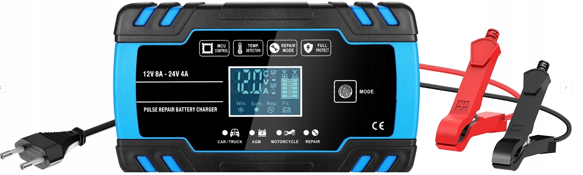 - ВИСОКА СУМІСНІСТЬ - випрямляч керується мікропроцесором, який автоматично регулює зарядний струм відповідно до напруги. Має функцію автоматичного визначення напруги акумулятора (12 або 24 В). Він ідеально працює з кальцієвими, гелевими, AGM та мокрими акумуляторами, що означає, що його можна використовувати в автомобілях, мотоциклах, газонокосарках, човнах та інших транспортних засобах. зарядний пристрій містить надзвичайно практичну функцію, яка полягає в вбудованому захисті від короткого замикання, перегріву, обривів ланцюга, перезаряду, перевантаження по струму, зворотної полярності та іскор. Крім того, пристрій автоматично заряджає акумулятор, що додатково захищає акумулятор. Завдяки цим функціям ви можете залишити зарядний пристрій підключеним до акумулятора необмежений час.
