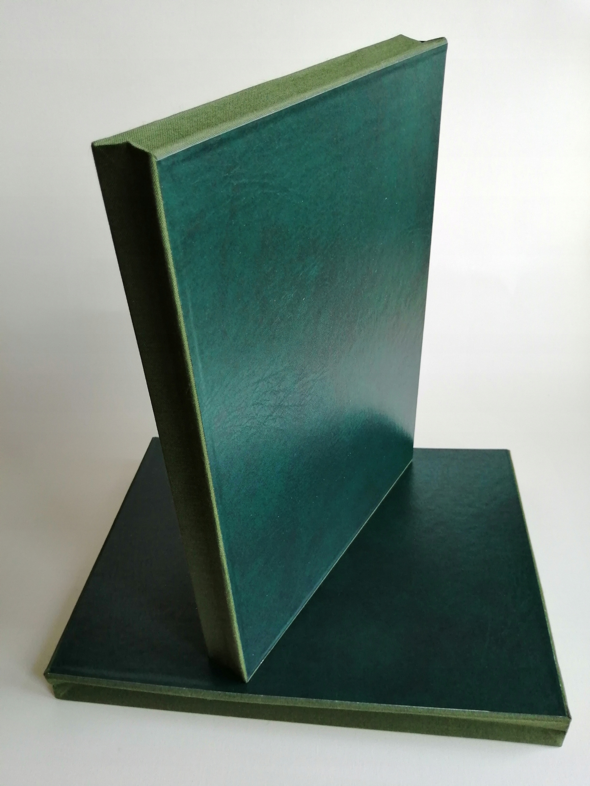 Конструкція - суцільний картон з проклеєною італійською палітурною тканиною. Боковини покриті ПРЕМІУМ шпоном з текстурою шкіри.