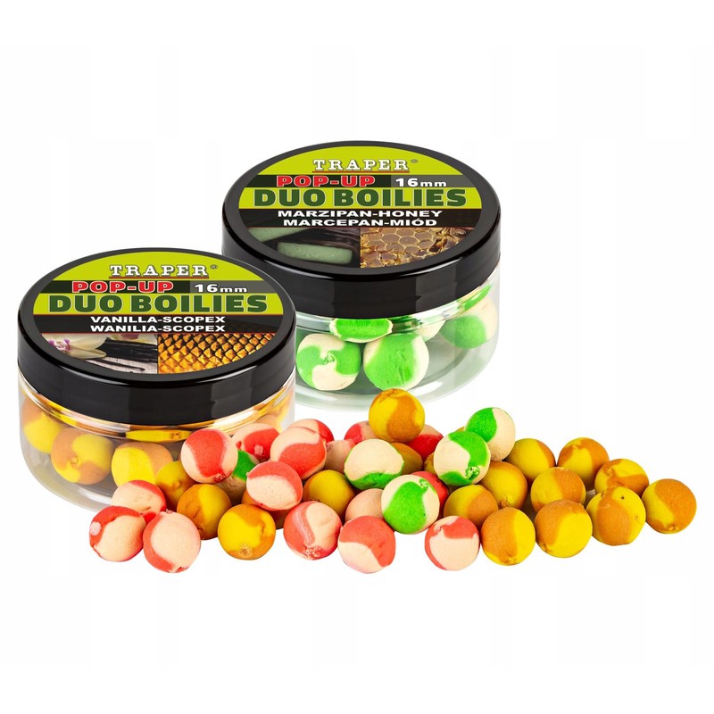 Traper Pop-Up Duo Boilies 16mm– це двоколірні приманки для качок із різними смаками, які дуже ефективні під час риболовлі на рибальстві з дуже високим тиском риболовлі, як під час риболовних змагань, так і під час розваг. Особливо люблять короп і білий амур. Завдяки використанню натуральних інгредієнтів найвищої якості та передовій технології виробництва, плаваючі кульки Pop-Up дивують своєю швидкістю дії, перевершуючи інші приманки.