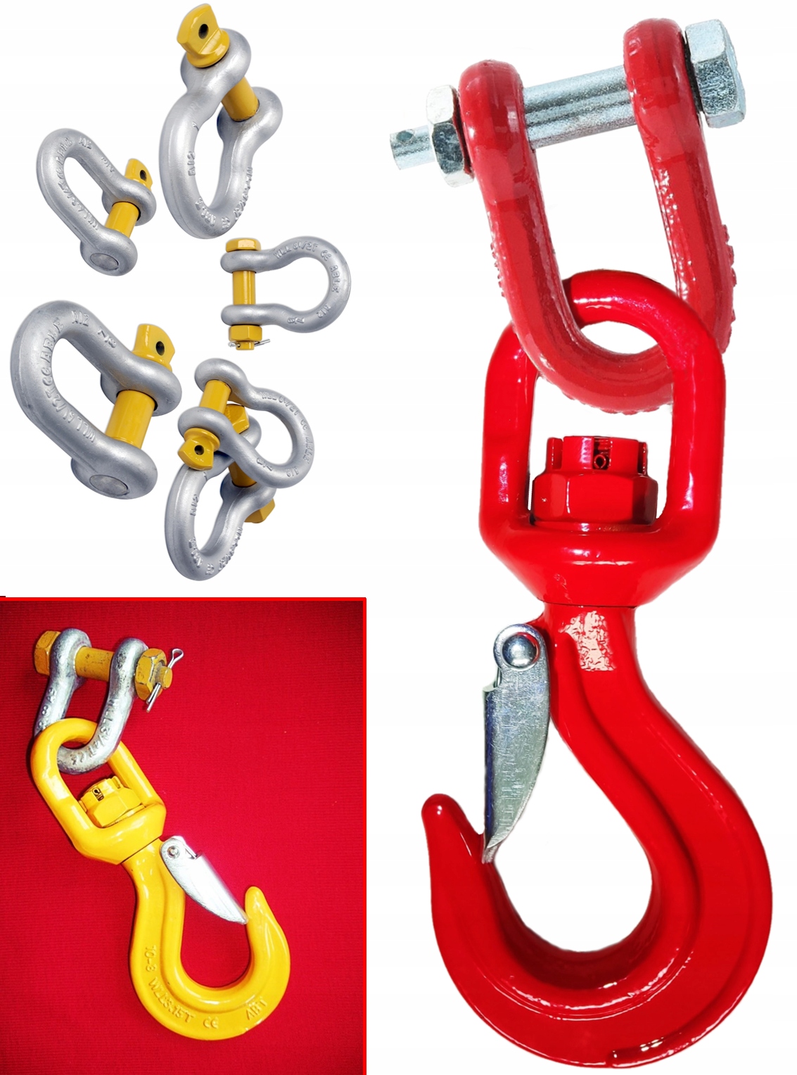 ЗАСТОСУВАННЯ: Для ланцюгових, канатних і текстильних строп, для підйомного обладнання, гаків, ідеально функціонує як з'єднувач у будівельних машинах / екскаваторах, навантажувачах, бульдозерах та інших як поворотний з'єднувач для запобігання укороченню стропів. Універсальність набору означає його багаторазове використання. Скоби в цьому наборі можна вільно від'єднати від гака.